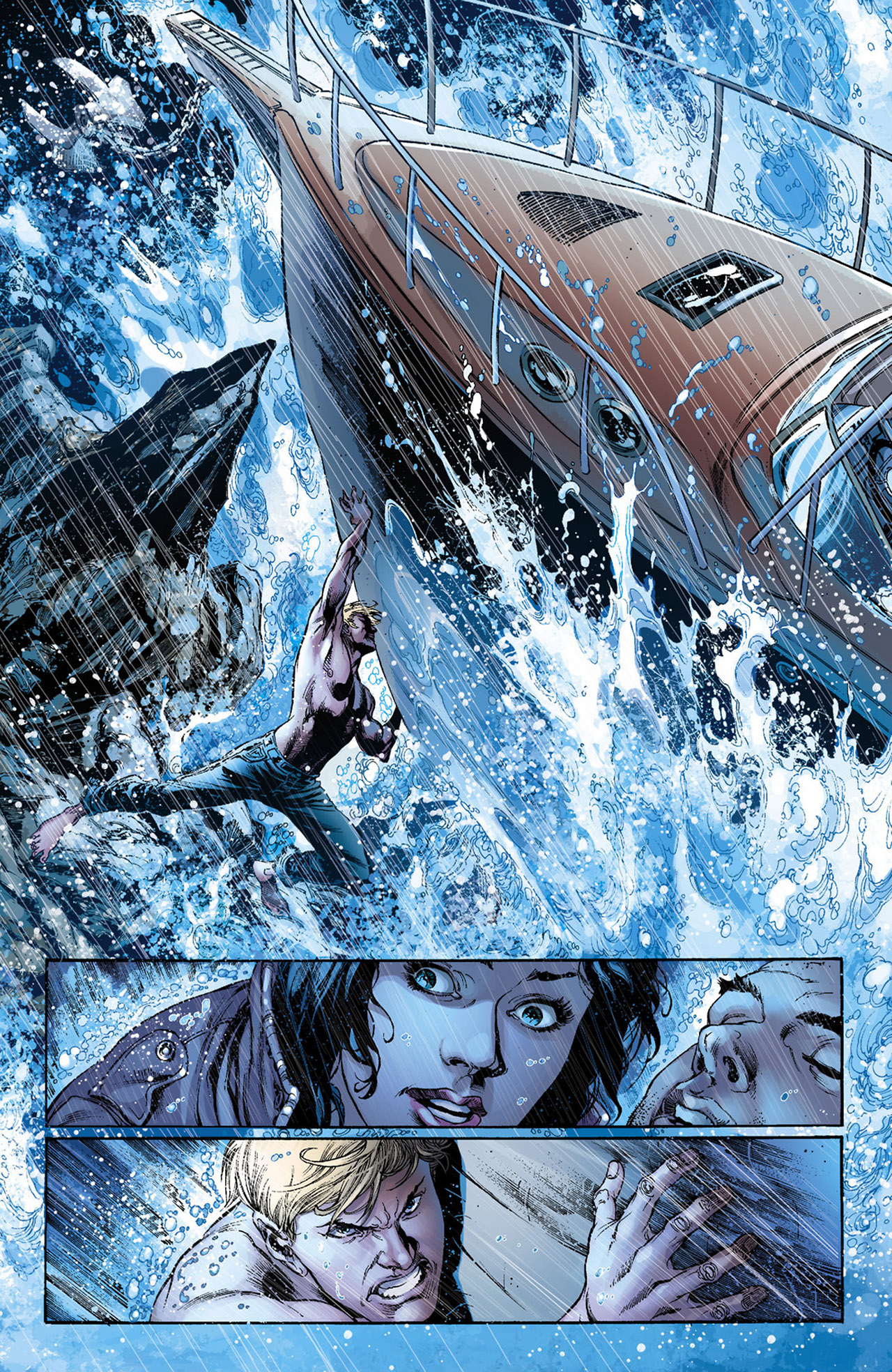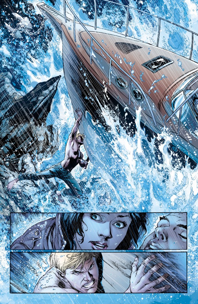 This scene has the word epic written all over it. It reminds me of Superman lifting the car on the cover of Action Comics demonstrating the true strength, grit and determination of the superhero. There are many aspects of this scene that makes Arthur Curry look incredible; the rain which is so vividly drawn making it look incredibly wet and dangerous, the sheer mass of the boat, the dangerous rock edges and the fact that Aquaman is bare feet with an arched back lifting the yacht. The extra panels add to the scene but to be honest the main panel says it all. The colouring takes a dark water scene and gives it pure clarity. This is just excellent artwork demonstrating how to make a superhuman feat look just that.