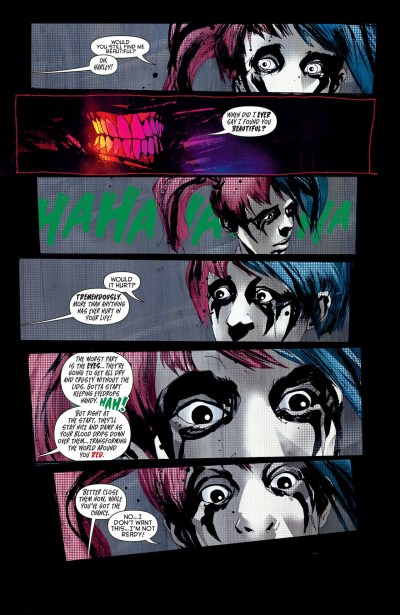 I have been waiting to use Jock’s work as part of my iconic art sections for a while now. The side plot stories at the end of Batman are incredibly well drawn. They are very atmospheric and his use of colours and facial features really emphasise the scene. This page his haunting as we focus on Harley’s eyes as the Joker begins his mental torture of her. It is not often you see an artist be able to show a range of emotion with just with their eyes. In this one page we see Harley inquire with hope, shy away with despondence and then slowly become more anxious and frightful. Instead of the drawing the Joker we see only his teeth flash reddened with a maddened grin, which is probably all that Harley can see too. Jock chooses to show the essence of the Joker and it is incredibly effective a strategy to convey emotion. The colours are muted and heavily shaded placing prominence on Harley’s face and the darkened despair of the scene. These final pages of Batman 13 were an excellent addition to the already brilliant main story and Jock deserves a wealth of credit to match up with his colleagues. I look forward to his work immensely.