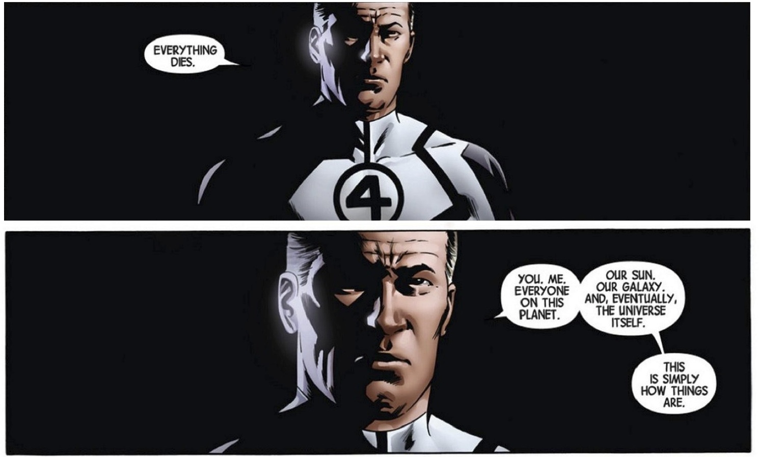 If you have read my blog previously then you may have picked up my love for Manhattan Projects, which is a brilliantly complex and original idea for a book. Its author Jonathan Hickman has been given the opportunity to take on well-established heroes, and guide them through parts unknown. He has been passed the mantle from Brian Bendis, who has left giant shoes to fill. Steve Epting first came to my attention when he pencilled Ed Brubaker’s epic Captain America reincarnation. His style is heavy, thick and rich style, which really suited the depth and seriousness of Cap and Bucky. They have both worked as a creative partnership on FF and have been rewarded a Marvel toy box of superheroes to play with. In my comic reading lifetime The Avengers has only been written by one man, but now Hickman must carve his legacy afresh and anew.