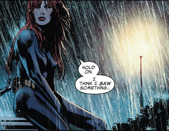 Bucky has been trying to bring back Natasha, who has been brainwashed by a fellow sleeper agent by the name of Leo Novokov. The story was been very well paced and told with great suspense, as Novokov appears to be a valid threat to Bucky. The brainwashing of Romanov has led to Bucky reminiscing over the love they shared, whilst she is trying to kill him. It’s a very interesting parallel to when Cap had flashbacks to his time in the war with Bucky, way back in the Winter Soldier storyline. The theme of the book is perfectly suited to Brubaker’s stoic storytelling, and Black Widow provides meaning to Bucky’s despair. Butch Guice really shines on this book, and would have been a brilliant artist for Brubaker back when he first started. The mood is created by wonderfully drawn rain backlit by car headlights, moody snow blotted city landscape and silhouettes, and Nastasha in a cemetery, sitting on a tombstone, while the rain takes her hair down over her eyes. Just beautiful imagery and with the emotional background it just makes it such a poignant scene. The colouring palette is kept to dark shades of blue-black, and red, which highlights the scenes morbid nature. Even the sound effects are largely in red on a dark blue background. Huge credit is given to Jordie Bellaire and Bettie Breitweiser, the colourists, for really layering the atmosphere.