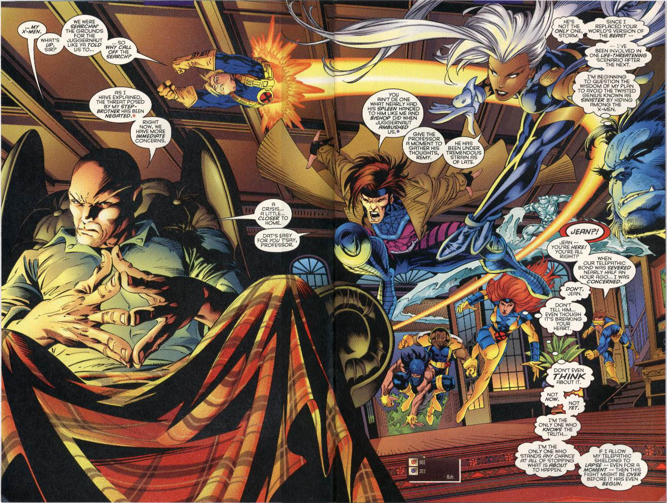“Oh my God! I cannot believe this has happened, it is the most epic event and Professor X has abandoned his X-Men. There must be some bad guy who has taken over his mind, because I find it hard to believe he could do this! Xavier becomes Onslaught and looks like a terrifying demon and attacks his students, without guilt. The scene where he sits there looking ahead, with his hands held at their fingertips, and his students looking expectantly at him, is just incredible. This is going to be big and I have no idea how they are going to stop him. What I do know is that there is no coming back from this: this is it! Professor X-Men is no more. There is only Onslaught!”