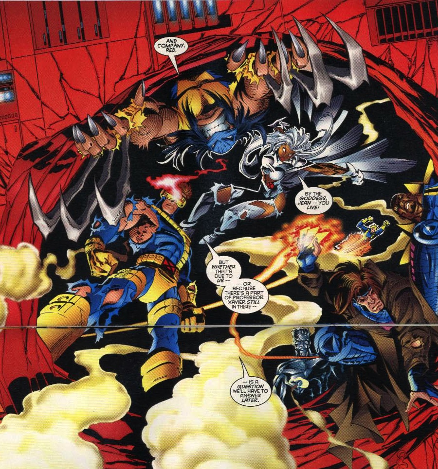 I was so obsessed with the event that I never appreciated the narrative. I didn’t even know what that word meant; I was a super science geek, with aspirations of becoming a doctor. I read that book now, and I still feel nothing but love for it. I can feel the shock and excitement that I once did, but I can also see the things that would irritate me now. There are an incredible amount of words on some of the pages. The Jean thought bubbles that occur during the massive Xavier diatribe, are distracting and a little confusing at times. It’s quite a complex story with many different sub plots coming into play, as there is a scene with the Avengers, X-Man, the Fantastic Four and Franklin. There are also flashback scenes and comments alluding to Magneto’s involvement. It’s all thrown in there in a relatively non-coherent fashion. It is hard to believe it was written by Mark Waid and Scott Lobdell! The artwork is fantastic in places, especially with the X-Men stand off sequences. They look ready for action and it is brilliant seeing the feral, dumbed down, bone clawed Wolverine, standing next to the strong and fearsome leader Scott. Adam Kubert and Dan Green are loving the angles. They seem to be drawing from all perspectives including, looking down at Xavier’s baldhead, at an oblique angle through a window, from below a flying Onslaught and, my favourite, looking up at a hole in the roof with the battle scarred X-Men ready for action. I do love them, but at times it is a little confusing and difficult to follow. The power sequences look dramatic and brightly coloured, and the comic means business.