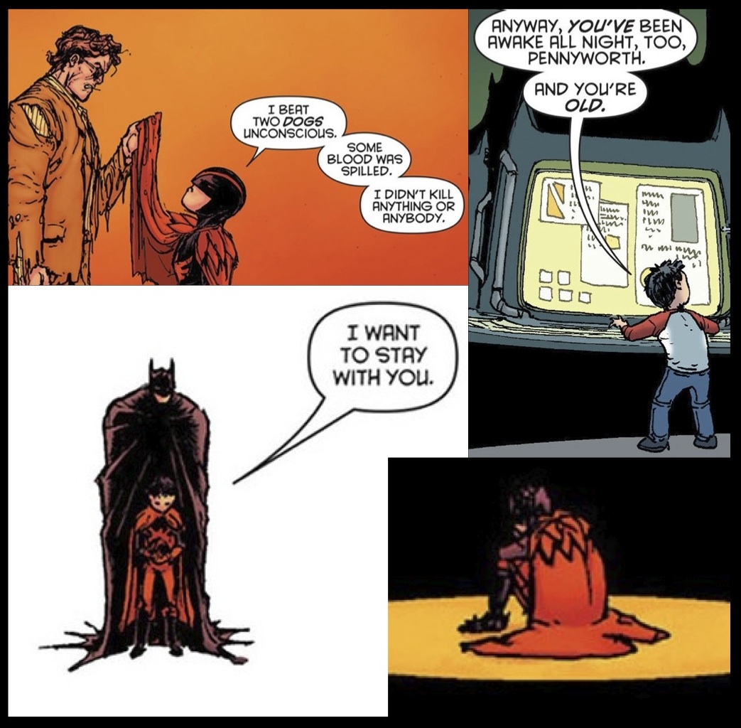 If Burnham can draw Damian as a superb hero and yet as a child, then how does he begin to show his death? I was in two minds when I produced the next collage because it just seems so wrong. He is beaten. He is bloodied. He is left calling for his father. As good as Burnham is drawing Damian when he is winning, he is as good at showing him losing. This needs to be the case especially when the story dictates it. It is more justifiable having a child injured but coming out the victor. It is a heart wrenching moment and a lot of these panels are shown from a distance, maybe to keep us at shoulder’s length from them too. Not that it really helps hold back the despair.
