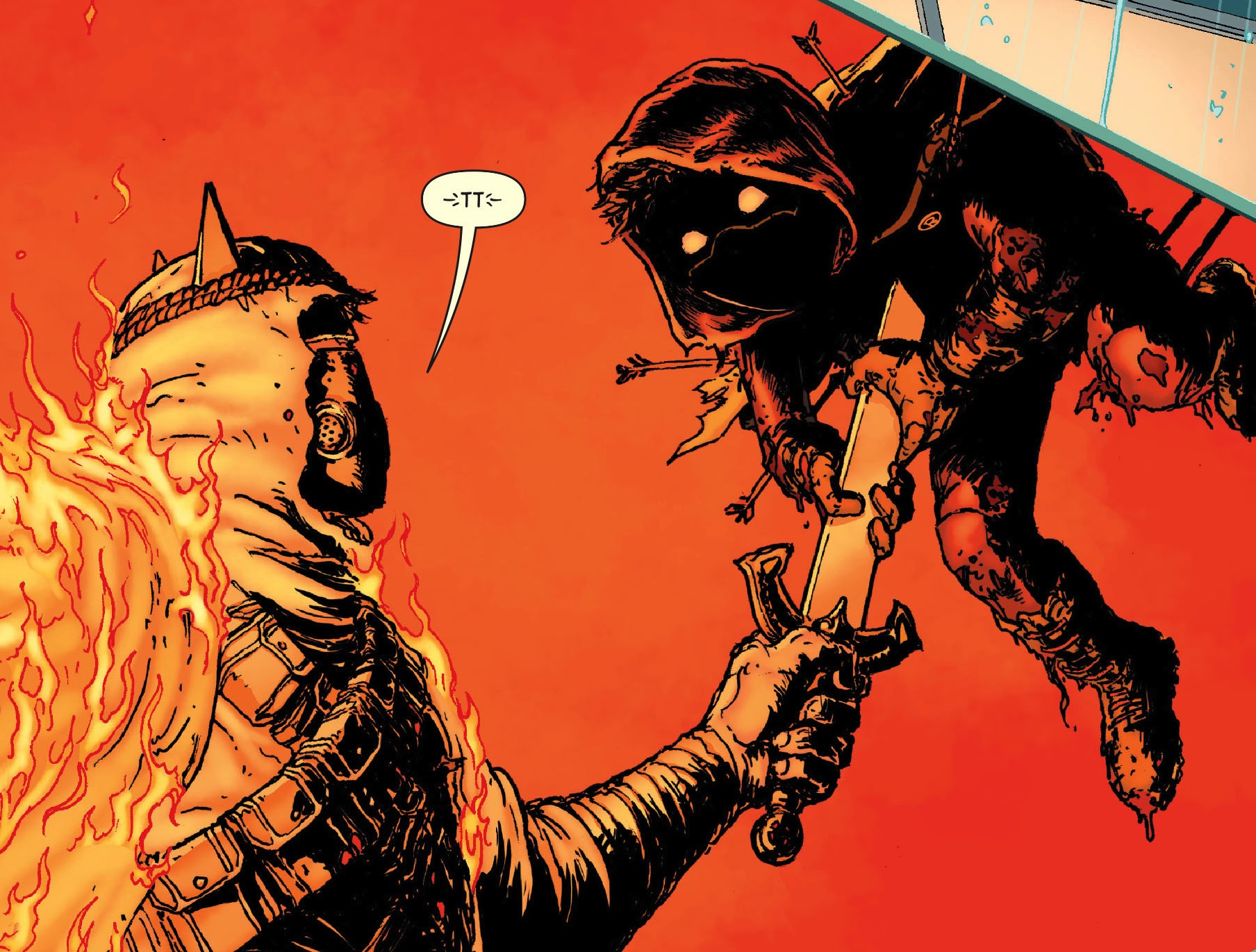 This is the kind of ground that is not covered often, and resides in the creepy corners of Crime alley itself. Batman Incorporated does not pitch itself to be a book of severe violence and desperation but we are treated to this. There is almost a compulsion to view Damian as an adult, otherwise how else can we justify what we are reading? Chris Burnham has done such an incredible job at keeping him innocent and vulnerable, despite a thick skin, armour-laden façade. I cannot fail to see him as a ten year old and I am averse to seeing a child stabbed in the gut with a massive sword. I find it interesting how he is drawn in the penultimate panel because the techniques Burnham uses are nowhere to be found. Damian’s face is not even shown, all we see are the whited out holes in his mask, amongst a totally blacked out façade. Maybe the artist is as upset as we are and he may be trying to make the bitter pill minutely easier to swallow. It is his artwork that has captured the character Damian Wayne so well, that leaves us so upset.