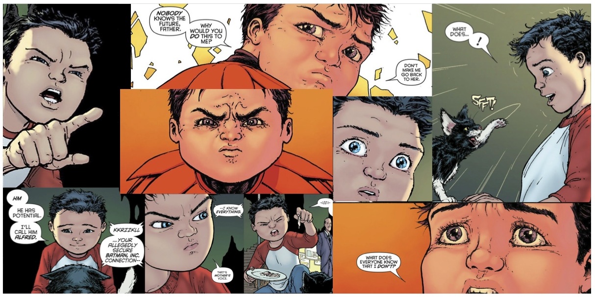 Chris Burnham captures the essence of Damian. He uses a couple of techniques that are incredibly effective, which are only used for him in the book. Though that is because he draws few other children. The ways in which he draws his frame is essential to capturing his childhood. Many artists can draw children as small adults. This is a misrepresentation because children have larger heads and Chris bears this out. It often leads to shots from a distance that compares his size to the people around him and the items in the background. This technique is also used to emphasize and emotional moment. When Bruce is reprimanding Damian and when he is unhappy, it is often shown at a distance. Damian often feels as if he is treated unfairly, and we can all empathize by feeling like we are the smallest kid in the world. This distancing effect becomes quite endearing and emotional.