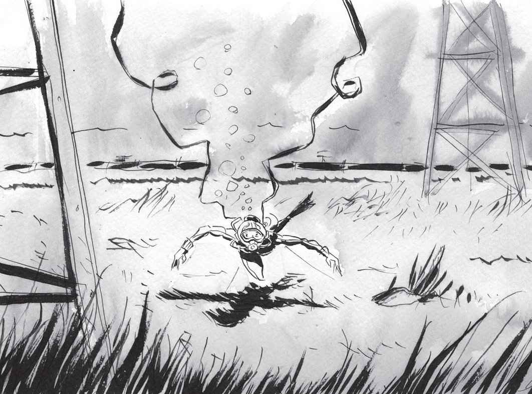 Jeff has an artistic style his own. He creates the atmosphere by zooming in and out of scenes, to allow a revelation or a surprise to slowly emerge. Jack and his father are drawn exceptionally tired. The facial lines, the sunken slanted eyes, the small bits of stubble, the scraggy hair make for a haggered look. It is a black and white book, which has great textured shading in the skyline and underwater scenes. This adds to the misery of the rainy little town and the mysteries of the deep water. Somewhere there always seems to be a tap that is dripping.
