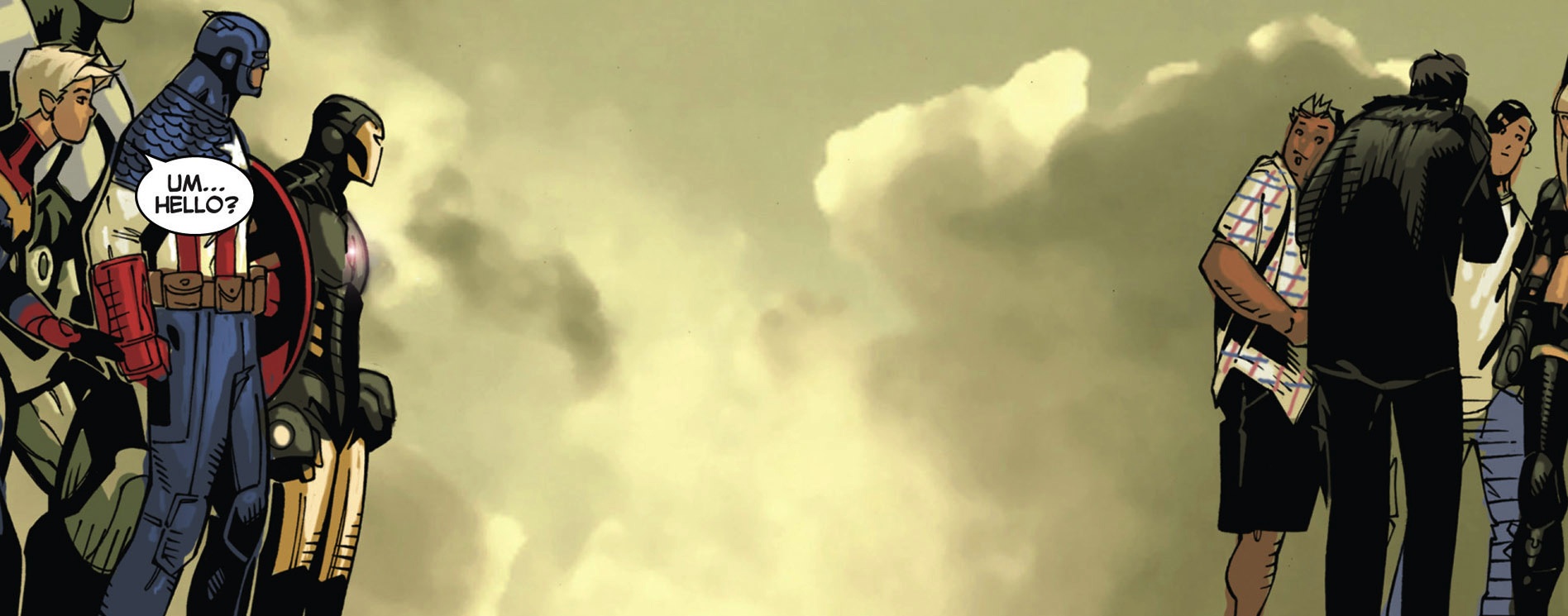 There is a single page in this book which demonstrates the problem with the Avengers vs Scott dichotomy. Eva addresses the balance of racism by interrupting Cap and tells him of her experiences. This is quite a moving panel and beautifully highlights the struggle of new mutants. This is what Scott has been trying to express for a long time now and what he has been trying to prevent: persecution of new mutants. His approach may or may not be partly responsible for the reactionary responses. That is not to say that Cap hasn’t addressed these concerns, because in Uncanny Avengers he integrating mutants and Avengers into a single team. The only remaining problem, as far as I can see, is who is responsible for the death of Xavier. This is clearly a difficult judgement as he was killed in battle when Scott was possessed by the Phoenix. Which could easily be argued was because of Iron Man. Instead of Eva calming the situation with her interlude, we move into another unnecessary reactionary response: Hawkeye readying an arrow to the X of Cyclops’s headgear. This then stupidly triggers a rallying cry to an impending battle. Eva shines by unleashing her mutant ability and nullifying the situation, peacefully. Bendis then allows the world to see the persecution of mutants via social media and Scott comes across as the strong misunderstood leader. The conversation between Eva and her mother is beautifully poignant, in displaying the lack if understanding of the mutant struggle. Her character brings refreshment to a stale staple theme of the Avengers and X-Men. Simply written and beautifully demonstrated by a new mutant who has more sense than anyone else in the comic. I really hope we see more of Eva Bell.
