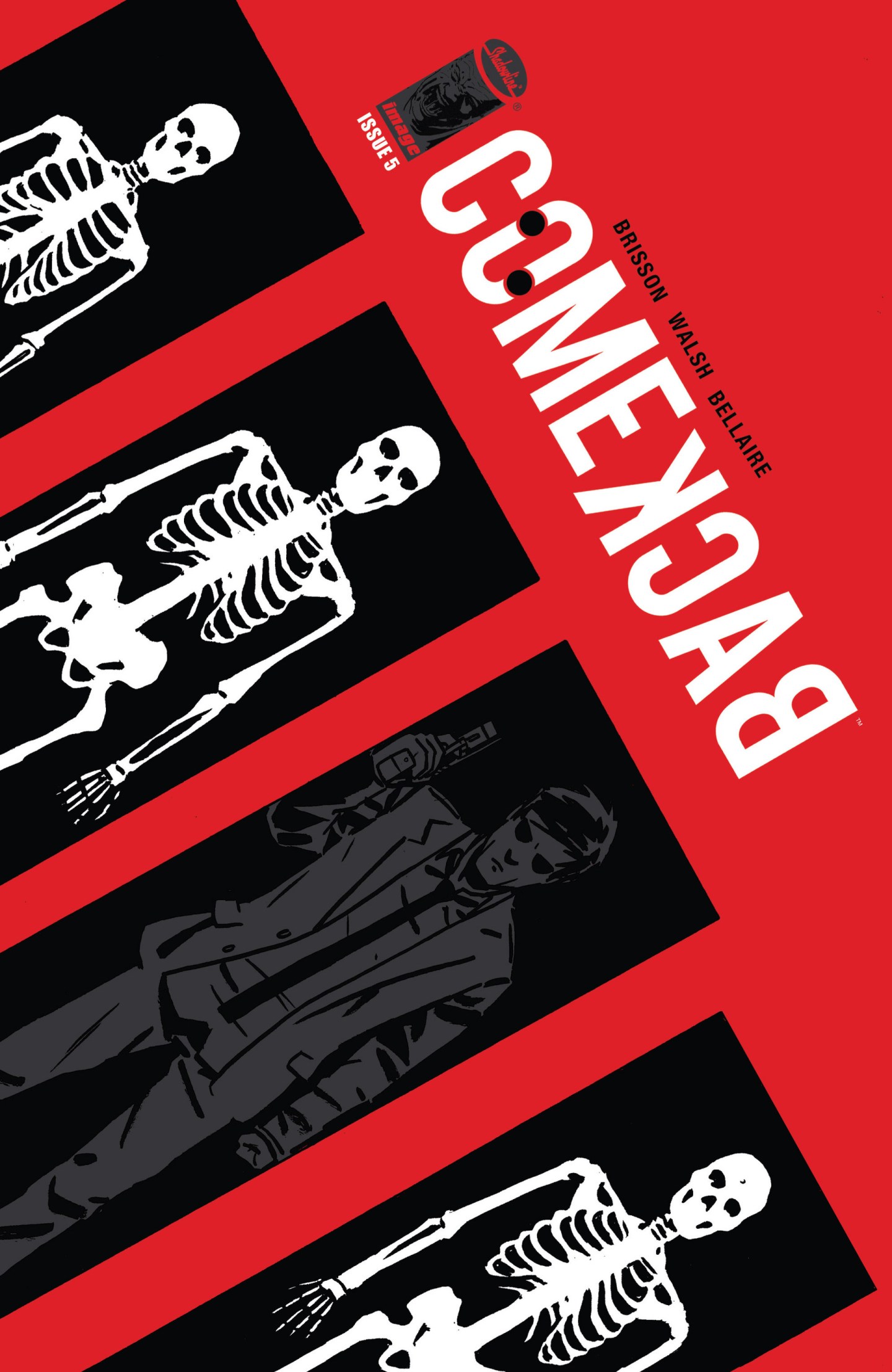 The colours red and black are often used to represent blood, love, lust, death, depravity and are often used together. Here they are used to great affect to represent death and violence. The conveyor belt effect of the diagonal rectangles with skeletons inside is quite poignant. These clearly signify death and look like coffins, which is why the figure placed in one of them, looks all the more creepy. The grey shading offsets the black and red colouring, as he is hidden in the shadows. The skeletons around him and the potential coffins are genuinely scary facets to the cover, and the character hiding amongst them looks all the more out of place. The fact he carries a gun and looks so aggressive shows he is comfortable here, and is about to do something potentially evil. The composition to this cover is outstanding compared to the average cover especially the way the title slopes. It is a very stylish cover to yet another decent Image arc.