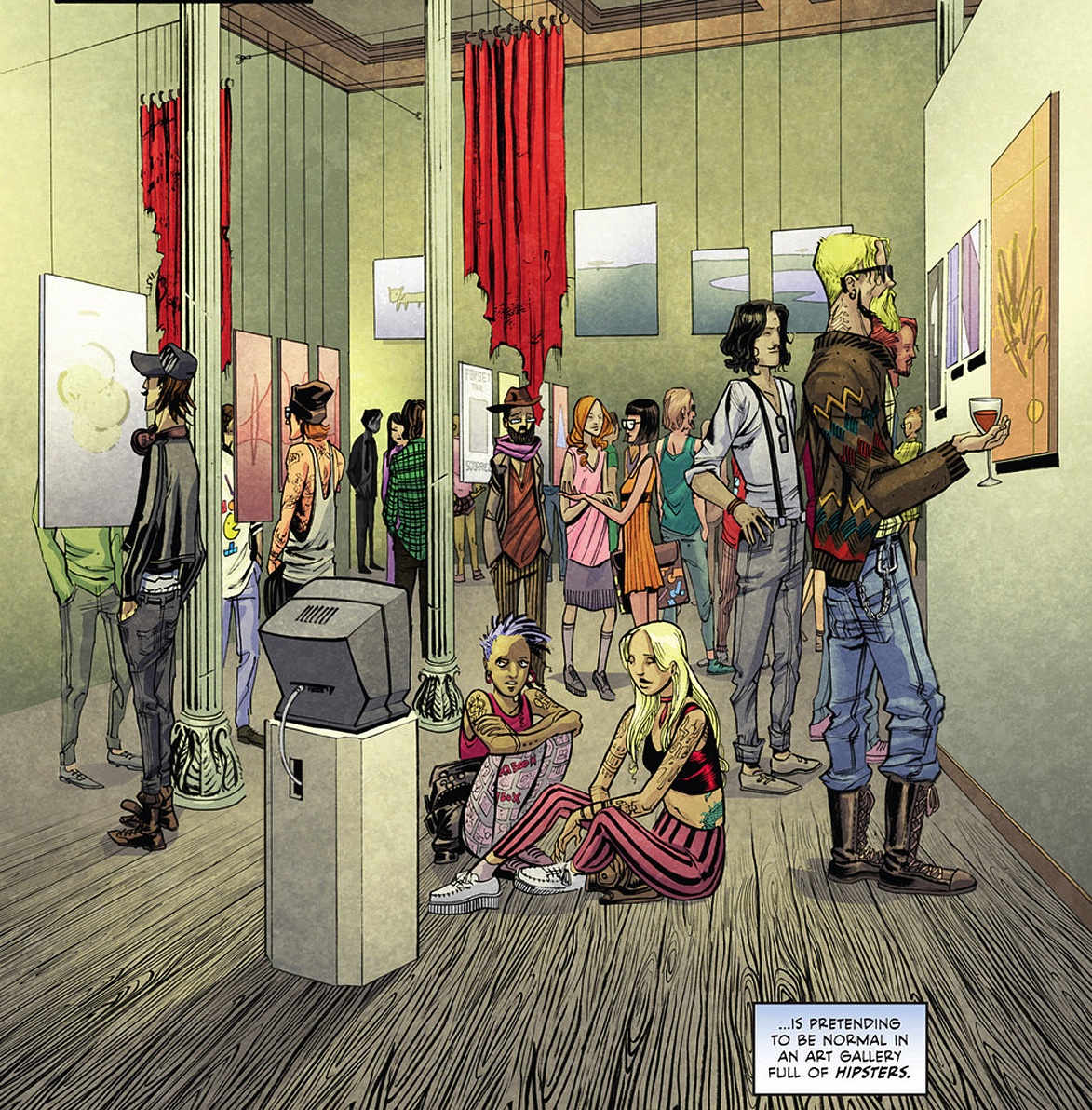 I picked this book up because I flicked through the pages and came across this page. It is phenomenally presented by Coelho as he brilliantly portrays every character in their uniqueness. Despite the all too deliberate hipster bashing (which I do not subscribe to), it is their quest for individuality that allows such colourful and decorated individuals. The scene depicts an independent art house viewing of Tim’s work and reeks of pretentiousness. Coelho utilises a zooming in affect to accentuate the conversation scenes, which works relatively well given that Tim is so apathetic. During the manic phase of the book, there is a superb splash page of Tim’s breakdown as the panels swirl about as passionately as our protagonist’s jig. In fact there is almost no need for though boxes here as the backdrop of photos, scrap paper and paintings swirling, reflecting the development of mania. Felipe Sobreiro colours vibrantly and provides stark contrast of the hipster-supporting cast to the initially docile main character. The book is wonderfully drawn and we are ready to be taken further into the depths of Tim’s mind. I hope that the personal and insightful preparations are not lost in a conspiracy dominated plotline, but either way the art will continue to impress.