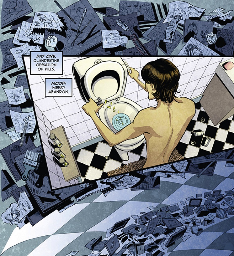Whilst the transition from lyricist to writer may not be a huge leap across the artistic spectrum, it is a further-reaching gap when you are the lead singer of a band and then you create a comic. Max Bemis is the man that leaps this cultural divide and has produced a book, emergent from the cultural underground of the Brooklyn suburbs. I can only imagine his protagonist Tim, represents himself, as both author and lead character have suffered bipolar disorder. I do not actually think there is a classic mental illness trope in the comic world, that is actually based on real experiences with clinical observations. There have been superhero characters with mental illnesses but rarely is it of a first person perspective. This is where Bemis, through Tim becomes representative of the disaffected mentally ill in modern society. He is an intriguing character as his internal monologue is flat and monotone, it is a little cynical for a medically numbed individual but imagine that guy narrating this book. The conversation pieces are fine as Tim interacts with classical cliche friends but his tone is reserved and reflective. His outward persona is incredibly muted and uninteresting but before long you realise his misanthropic monologue is the stimulus that keeps you reading.