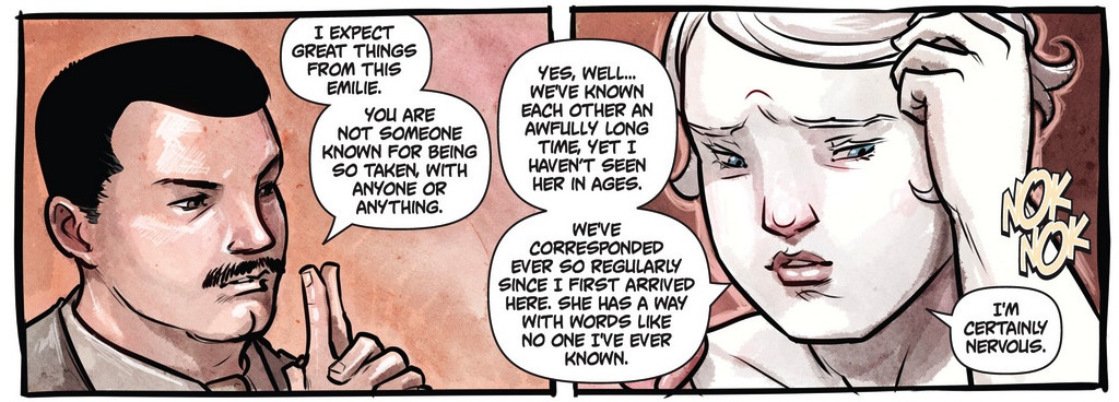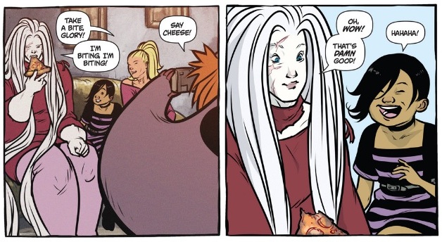 Glory #34 saw the finale of the second incarnation of the Rob Liefeld creation. Joe Keatinge and Ross Campbell have developed a wonderful series that develops the personal rapports of Gloriana Demeter and her troupe, amongst a backdrop of violent war. Glory is such a multi-faceted character that her obvious warrior like external appearance, is balanced with a deeply sensitive and caring personality. From the image below you would be mistaken for thinking that this is a comic book about raging battles with stereotypical superheroes. On deeper inspection, it is an image of Glory leading a rally with her family and friend’s beside her, grandstanding to all types of powered beings. It is visually quite spectacular with the thickened pencilling and vibrant colours, revealing classic superhero designs. I just adore how Glory’s hair seems to have a mind of its own and, not only provides grandeur to her character but also assertion and dominance.