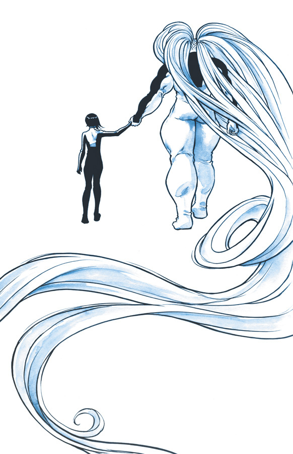 This final panel below demonstrates the artwork I will dearly miss, and it comes from its final pages: the depressed and redemptive Glory. Her physique is clearly a fluid state and there appears to be some control of it, hence the changes in battle. When the war is over, her body becomes more of a regular shape and I am not sure if it is indicative of a fall from grace, but she has no hair. She struggles to come to terms with the losses in victory and is despondent in her grief. Her shape, posture and facial expression speak volumes and it incites sadness in the reader. The pencilling is lighter and more delicate and a far cry from the denseness of her battle speech. Both Joe Keatinge and Ross Campbell have taken a cheesecake character and developed her into a complex and realistic hero. She is terrifying in one world but sweet and sensitive in another, which is a level of depth rarely seen in comics today. In a world where most superheroes are strong with little vulnerability, it is great to see a character with real frailties and a creative team happy to express them. Glory, you shall be missed.
