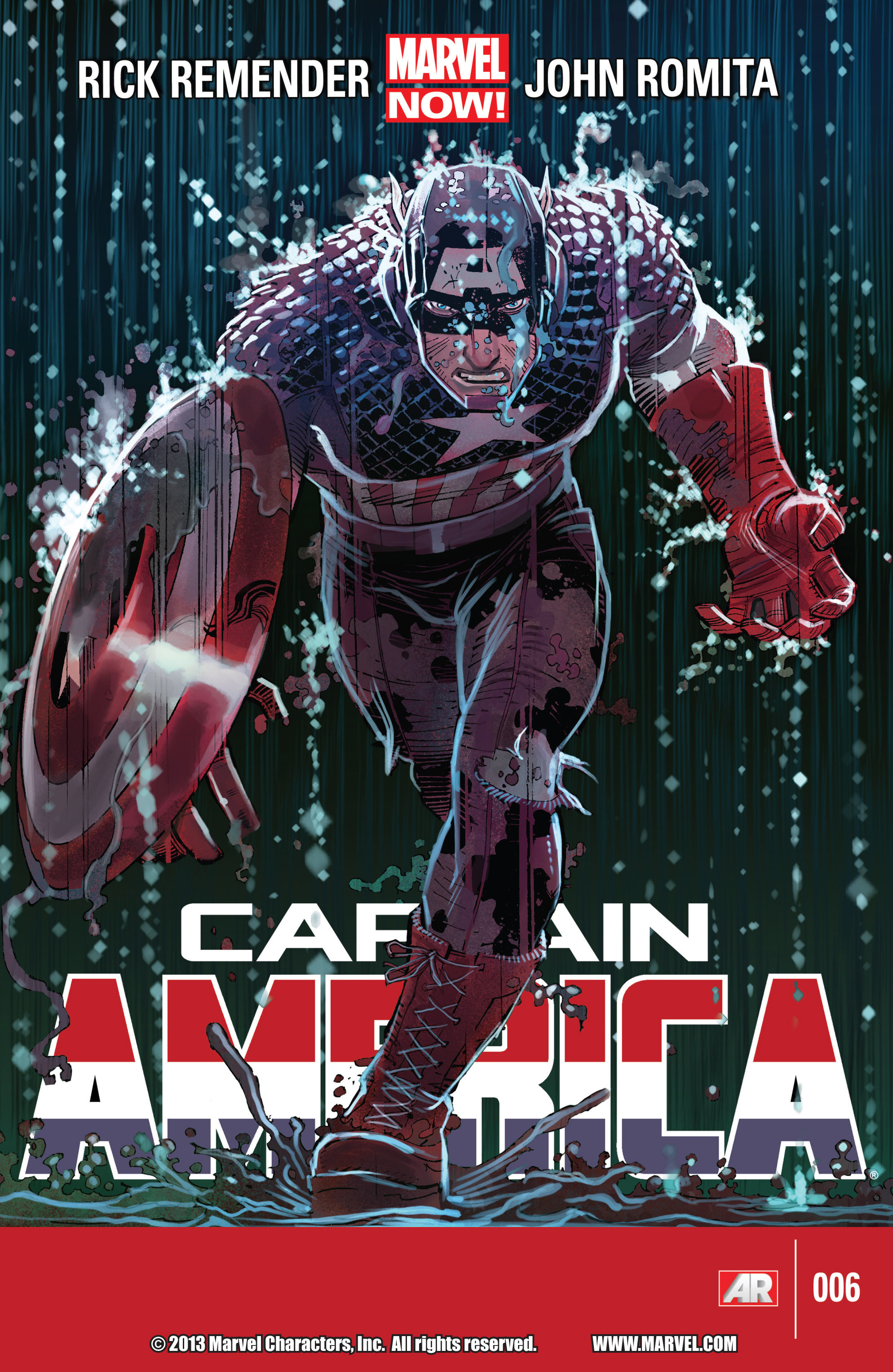 John Romita Jr has been a little off key for me recently, though I have thoroughly enjoyed his work over the years. Captain America is a decent book and I love how Remender has taken Steve Rogers to another dimension, in order to work a new angle. This cover is excellent because it is Cap at his most determined. He is bruised and he is beaten but he is running forward, unwavering and resolute. Rogers is leaning forwards with his back leg in the air, running at full pelt. It is drawn particularly well as it is fluid and dynamic. His facial expression is quite intimidating and his eyes are drawn half closed to imply focus. The left hand gesture is particularly aggressive as he seems ready to form a fist and unleash his aggression. The final act of violent dramatisation is the rain. In many artforms, especially kung fu movies the addition of rain seems to enhance the emotional content of the situation. It is well displayed as the diamond shaped drops splash off his body and drips down his face. The final touch of splashes around his foot completes the image. This is Captain America, he is running, and he is coming for you.