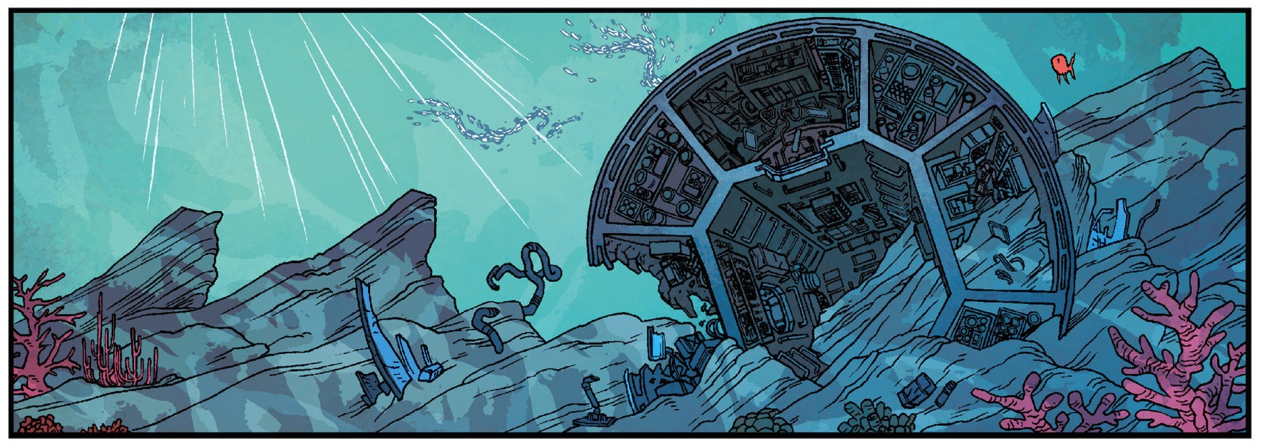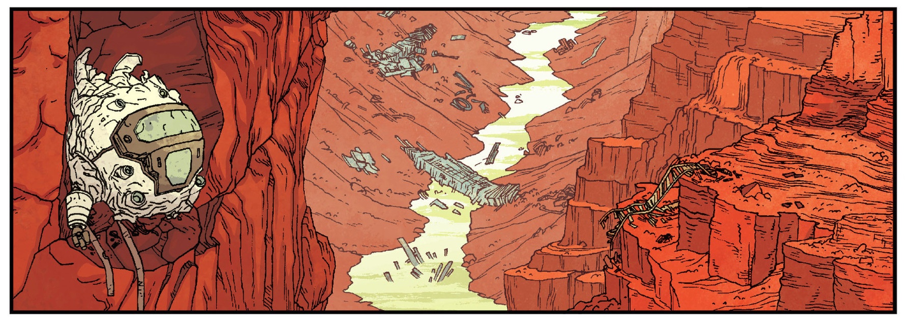 The book then moves to the outside world where each set has a distinct feel to it. The single page splash shot not only shows you what kind of setting we are invited to but also the feel, such as cold and wet underwater. The colours shine and paint different scenes and the level of detail are breathtakingly surprisingly. This is demonstrated by the shimmering sunlight on the rocks underground and the wonderfully red canyon scene, which is subtly shaded to give a sense of magnitude. When we then add the protagonists with the variety of colour in the dress, skin tones and illnesses of the World Corp, we are treated to some incredible work.