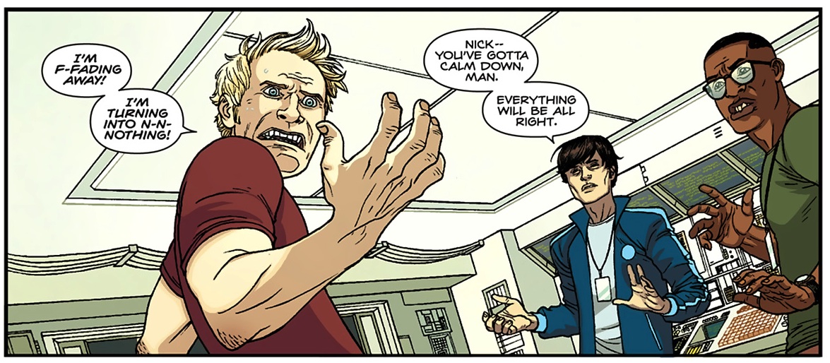 Nowhere Men is a stylish and cool comic with Nate Bellegarde pencilling with a succinct and firm hand. But it is Jordie that makes the book vibrant and expressive with its colour. They work with so many generic characters that are employed by World Corp, in the fact that they are scientists and engineers with similar features. When it comes to the original four founders of the company, there is a more varied set of panels. The success relies on a set in the sixties and the hairstyles and clothes making it easy to distinguish Emerson from Simon from Thomas. However the deeply toned colours of their outfits really make them individuals nonetheless. If they truly were a Beatles cover band then they would be easily recognisable.