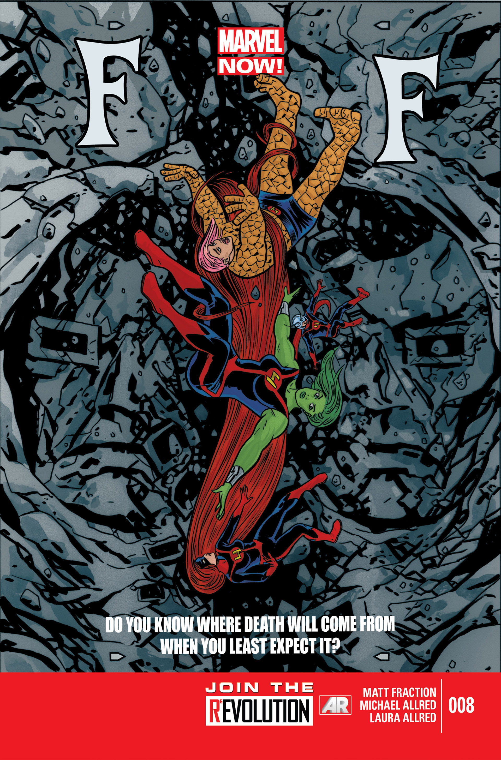 Michael and Laura Allred have produced a wonderful looking cover for this weeks issue of FF. The rock face background instills a fear of inevitable death, with our heroes falling perilously. Medusa’s hair looks incredible, as always, because her hair really does have a life of its own. In this scenario it is trying to grab her friends and keep them together as they fall. The subtle effects of each character fall in a different pose adds uniqueness with Ant-Man being shrunk and Darla falling in complete fear. The colouring is a great contrast of the dark grey rock facade with the the brightly coloured FF, giving the feel of a closing space and falling into the depths. Now if we observe carefully then we can see where the magic happens, because there are two sets of small arrows at the top and bottom of the book. If you fold the book so the arrows join then we have the transformed cover below. It is an incredible picture as you then begin to notice Doom’s face coming together. It would not be too far a push to imagine that Doom may have actually carved his image into a rock face! Even the FF symbol matches, with the horizontal stroke of the first F being completed by stone. The title of the cover reads, “Do you know where death will come from when you least expect it?” and when the cover folds, we receive the ominous answer, “Doom”. Just wonderfully original and innovative and, quite easily this weeks cover of the week. Kudos to Michael and Laura Allred.