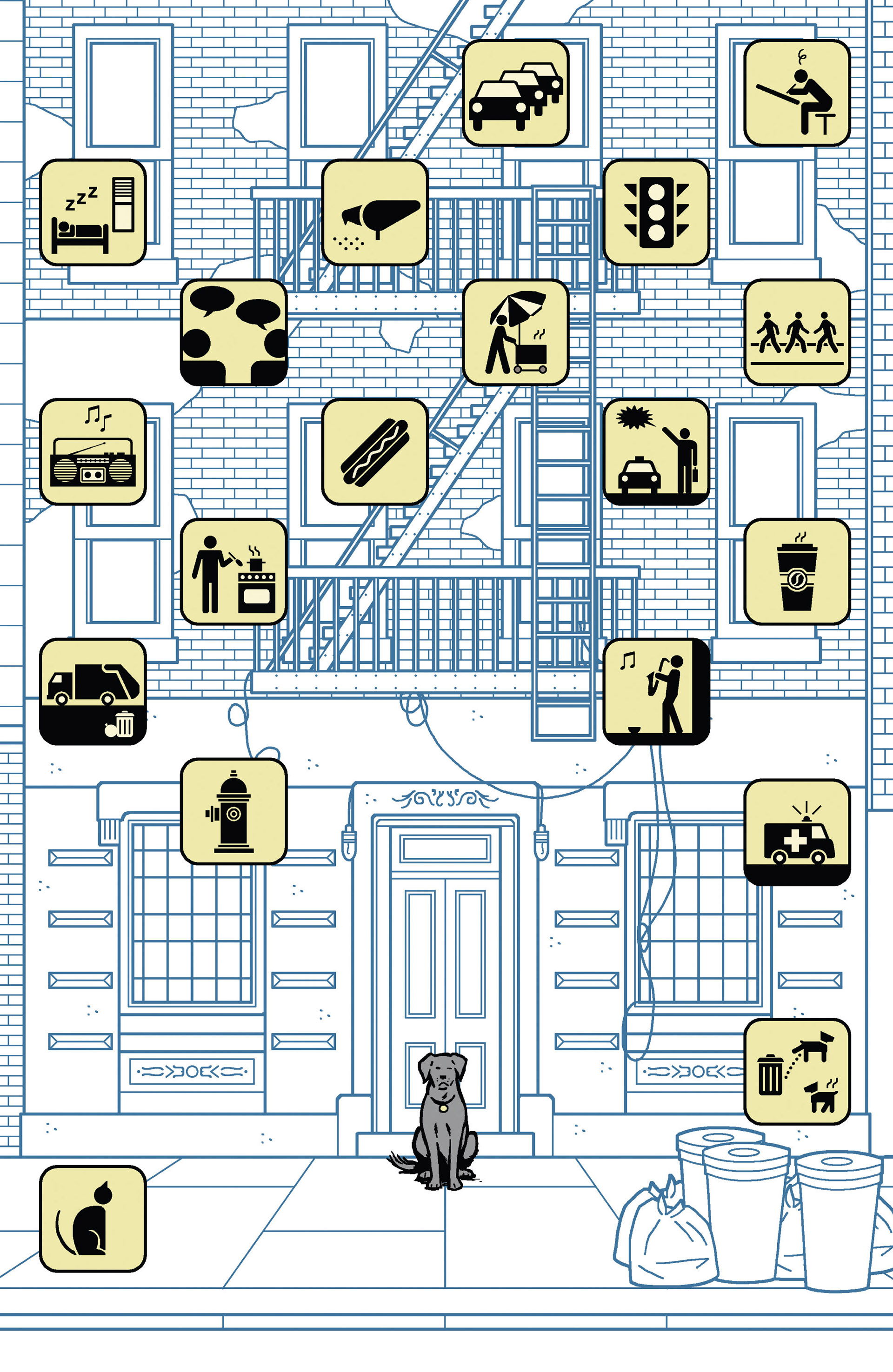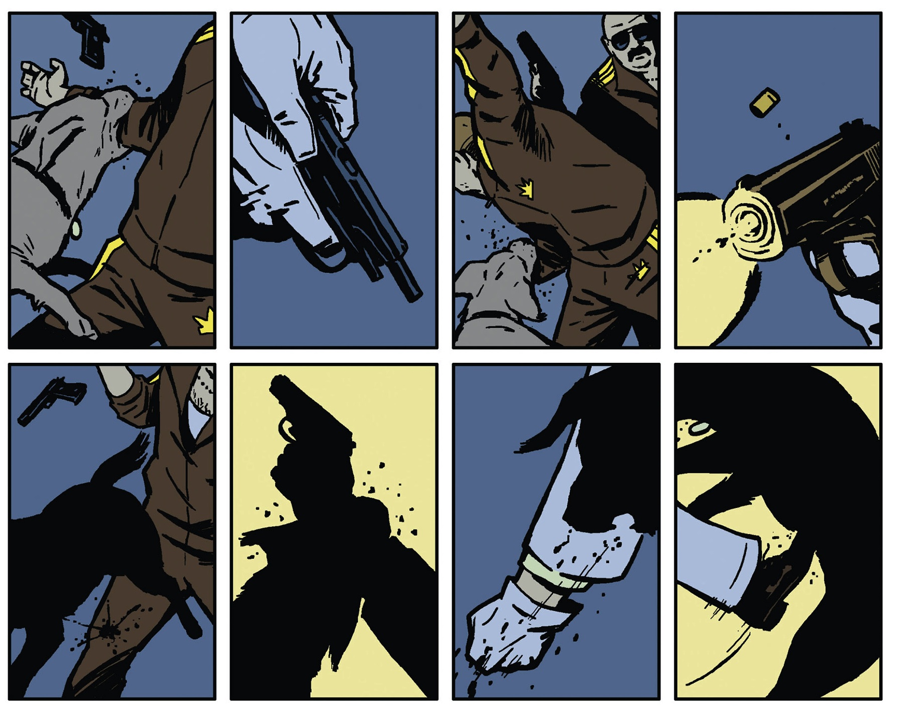 Imagine if you will, the classical detective trope of a cynical gumshoe lured by an attractive lady to a murder case. He hunts for clues, engages in fights with suspects, becomes wrapped up in a precarious sexual liaison with his client and even ends up captured, beaten, but determined. Welcome to the story of Pizza Dog. Not only are we privy to a great super sleuth caper, but we also engage in the further vicissitudes of Hawkeye and Hawkguy’s relationship. The true brilliance of the issue lies in the fact that these events take place through the colour-blind eyes of a canine. The storytelling is verbally ascetic with minimalistic dialogue and only isolated single dog command words are utilised in English and Russian. Lucky’s thought processes are communicated through olfactory thought circles, as he smells the identities of tenants in the building and deduces clues of the crime scene, all from his keen sense of smell. The delicate colour palette of Matt Hollingsworth focuses on yellow and blue, which is true to the dichromatic colour perception of a dog’s vision. The book contains wondrous moments of emotional turmoil and exceptional examples of artistic delivery, including Lucky’s sexual flirtations, the melancholy of failure, and a fortuitous escape scenario. Discarding the traditional use of language and combining the use of semiotics with Aja’s unique panelling style has led to an extraordinarily expressive book.