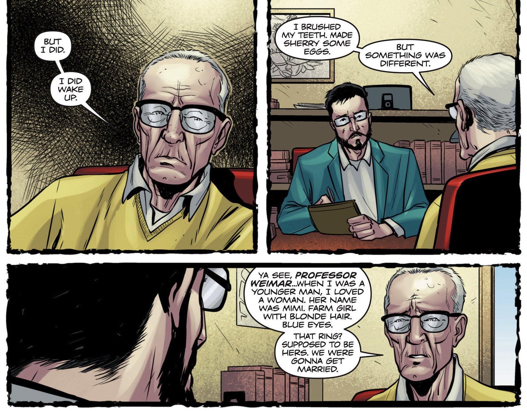 Tim Seeley builds on this classic lovelorn scaffolding to demonstrate the true emptiness of his reviver story. People may disagree but feeling pain is better than feeling nothing at all. The gentlemen knows he is alive because he hurts every single day, but the day he became numb to Mimi, was the day he died. It is a very intelligent passage when combined with the dream analogy, as not only do we relate to losing someone we love, but then Seeley takes it further into his fictional characters. To create a book with baseline zombie tendencies but to alter it subtly to convey complex inter-personal relationships is brilliant. It adds more depth and texture to the undead trope and the doors have flown open for Seeley and his revivers. This passage is delicately written to convey his emotion, even when we know he has none. The lack of pain is what made him know he was alive, now he feels nothing, now he cannot tell if he is alive, now he has become a reviver.