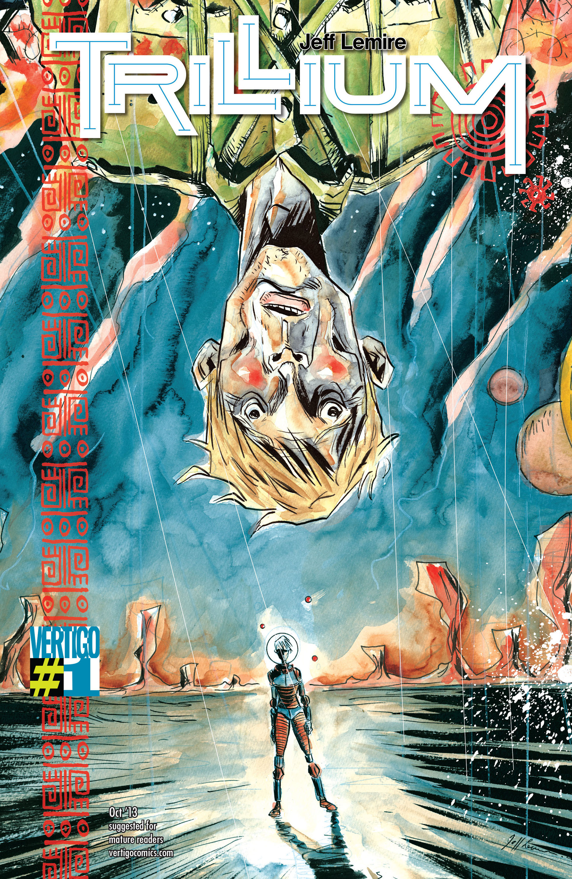 Jeff Lemire is a talented creator and is well known as a writer, but his previous works of Essex County, Sweet Tooth and The Underwater Welder have shown his skills as an artist. This comic demonstrates both specialties in a wonderful new title called Trillium. The cover is part of a double front page, which fits the stories portrayed in this book. It is a meeting of two people from different worlds and the covers compliment one another. Lemire has a wrinkly pencil style as his protagonists appear very weathered and fatigued. However the female lead looks more attractive but his imperfect style gives the impression of fragility. His characters have a realistic vulnerability and this is also portrayed excellently through their expressions. Both characters seem to be looking upwards and staring into the world below them, where the other inhabits. For the gentlemen it is wartime carrying an injured soldier and for the lady it is in a spacesuit wandering through a strange world. My favourite part of the covers are the delightful watercolours. The backgrounds are so pretty and the atmosphere so desolate and ethereal. I adore the skin tones and the symmetry of the front pages, with subtle red highlights. The dark colours of space and the sheer loneliness of our protagonists are accompanied but small highlights of red and orange giving an air of optimism and hope. This feeling is assured with the bright yellow colouring of the title, and I cannot wait to read it.