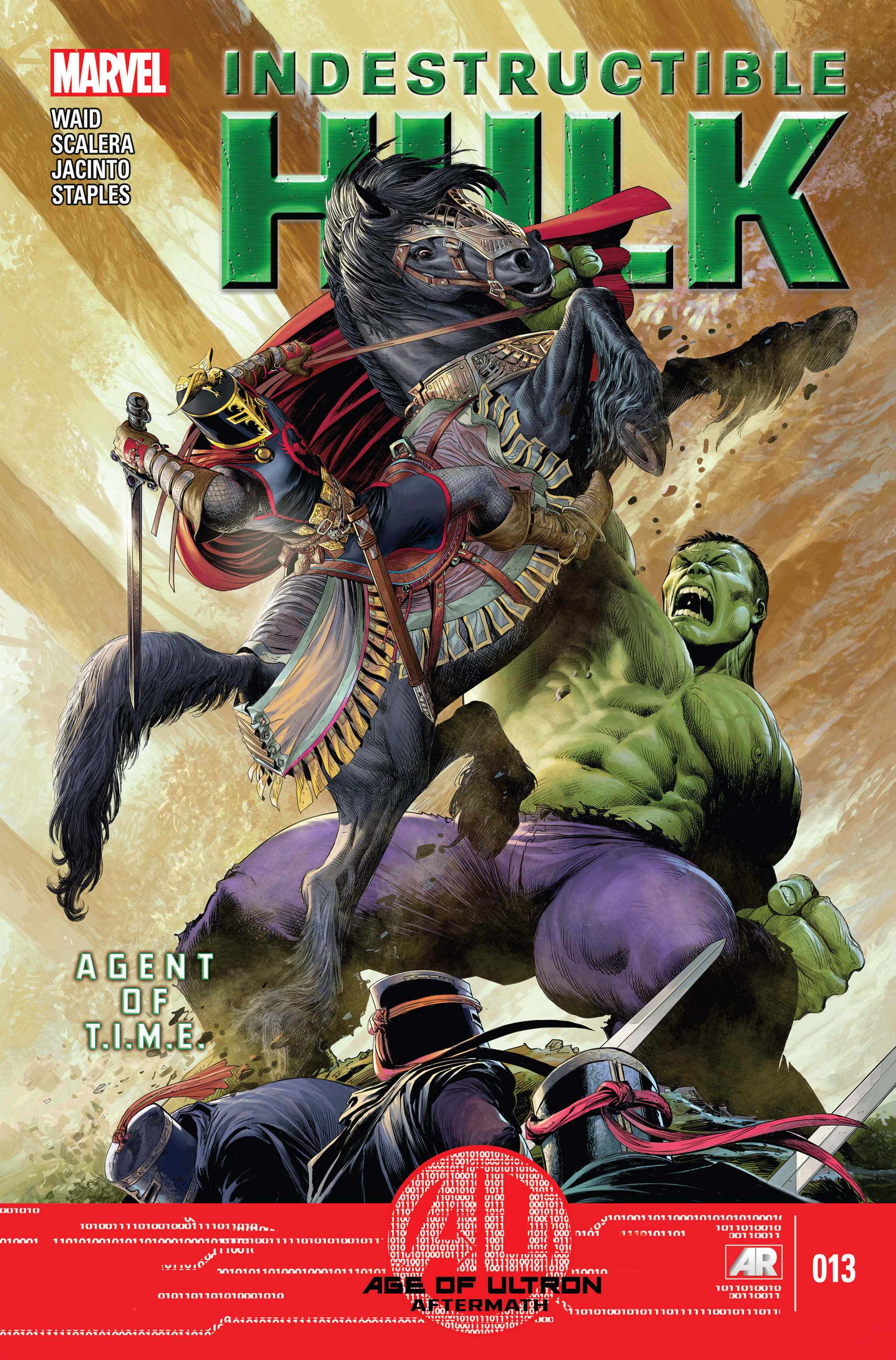 I may be sailing close to the wind by choosing a non lenticular page as my cover of the week, but for the last couple of issues now Mukesh Singh has produced lovely art. The beauty emanates from the page despite there being a huge eyesore in the form of an AoU symbol at its base. The feature of the page is not even the Hulk in full stretch green glory but of the majestic horse in mid leap. The details of the animal are incredible as almost each hair is visible with an expression sold solely through the creature’s eyes. Couple that with the ornate garb and the knight in full regalia, then you have an ethereal warrior trying to slay a giant monster. The rider has amazing depth to his belt, sword, sheath and helmet, it really is quite astounding. One feature which really stands out is the colouring. It is varied and bright and so much attention is brought to the horse and knight, that the indestructible one seems quite bland in comparison. It resembles religious iconography in nature, especially seeing the shades of daylight shining from behind the soldier. The Hulk looks quite turmoiled as he roars from below the horse in quite the uncomfortable position. It is almost as if Bruce is meant to be the enemy as he succumbs to the knight in shining armour. It is depicted as a scene from a tapestry. demonstrating a tale from biblical times of a monster needing to be slayed. Of course this is the opposite to the actual plot but it does not stop Singh from producing a poignant, impactful and epic fight composition.
