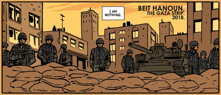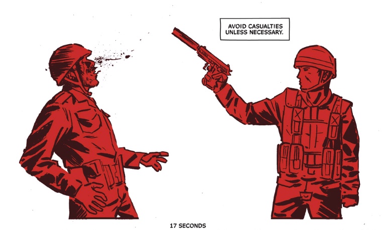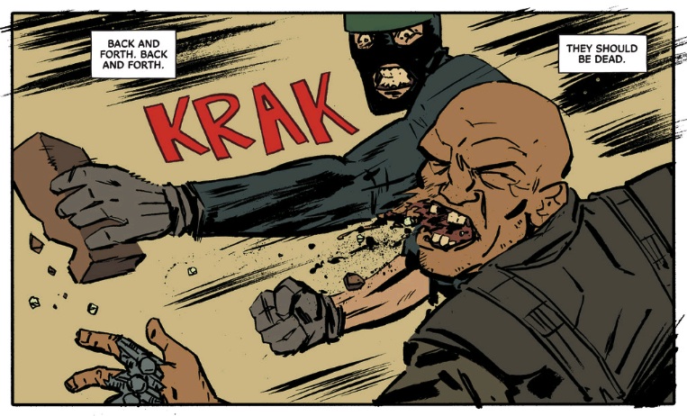 Jordie Bellaire is brilliant again on this book, as she uses varying colour patterns for the changing scenes of the comic. The old man has a blue hue to represent peace and catharsis on the sea, red on the inside of the tank to present danger and anxiety, and the grey of the unemotive central command characters. Her depiction of blood in the arid environments of the Palestine battleground, are vivid and violent, especially when Zero kills in cold blood where the panel goes completely red. The effects of journeying and brutality are excellently depicted and in keeping with the theme of the book.