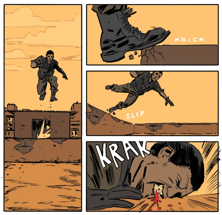 The artwork is situated in relatively similar environments with bland ubiquitous buildings, let alone the uniformed soldiers. Zero has to blend into the background, which is why the story focuses on his thought processes explaining the movements he makes. There are paged with small sequential panels that enable us to follow his tracks and move along with him. It is a superb way of making a run along the rooftops seem fast and erratic, whilst impressing panic on the reader. Interspersed with these pages are the battle sequences between two bloodied bruisers. The weapons flung and punches thrown hit with such ferocity that teeth fly and bones break. The contradiction of blood on sand is a vibrant and violent image and is emphasised during the book. There is a terrific panel where the silhouette of our antagonists is the only thing visible in a pile of smoke and rubble.