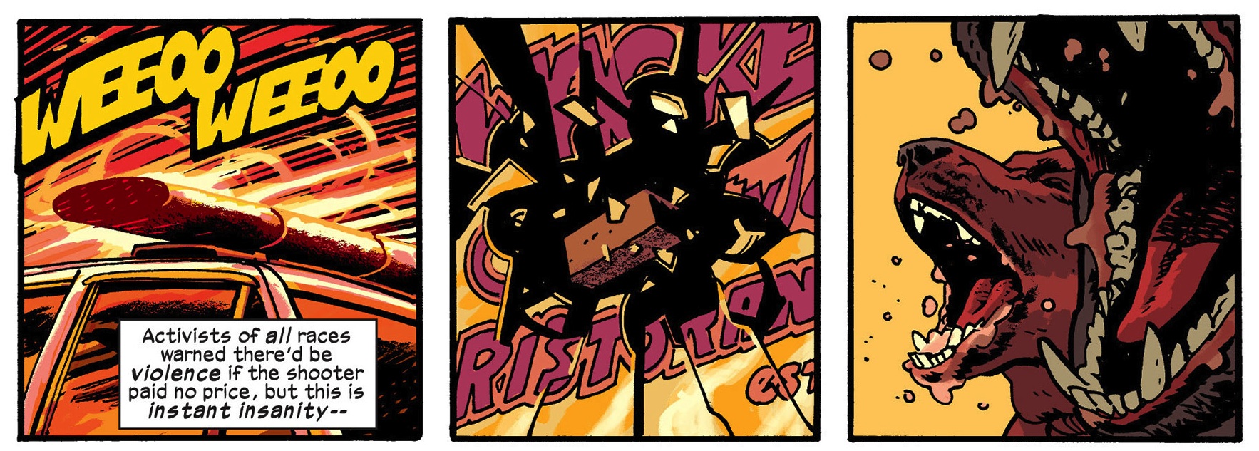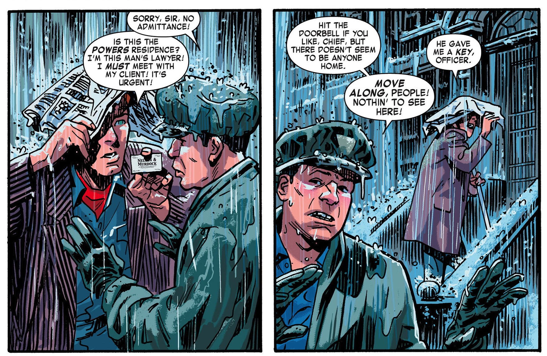 One of the most understated appeals of this book is Waid’s ability to tell a classic good guy, bad guy story. There is no flamboyant overly complicated plot with near omniscient antagonists, it is a tale told well. We experience the small effects of the villain that make them a threat and difficult to capture, and in this case it is the Jester who has the ability to manipulate media. Waid does not even elaborate on this skill but demonstrates it in action and effects with adeptness. He does not emphasize on dialogue and keeps it succinct and simple during conversations. The thought boxes are numerous and Daredevil’s internal monologue is always running through the book. This is because the dialogue is not interested in the bigger picture but how a man like Murdock reacts and responds to the situation. The bigger picture is provided by Chris Samnee in his wonderful artwork. The city is alive with mob rule and violence in the larger panels but there are lovely subtle displays of action in the smaller ones. This delicate balance is well maintained throughout and the single shot fight sequences are well structured and emphatic. The scenes of rain outside the courtroom are beautifully rendered with phenomenal colouring by Javier Rodriguez. I have always said that Samnee’s pencils are on the thick side but each stroke is purposeful and it never feels clustered, even in the crowd scenes. His use of shading really brings out the emotion with exceptional colouring accompaniment. Most importantly it is the small panels that depict Matt using his hyper senses such as hearing and ultrasonic vision, which truly show him in action, as opposed to the actual fight scenes.
