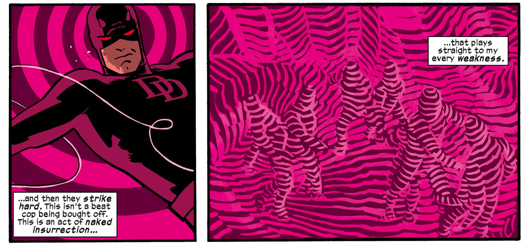 This is an incredibly clever book and so brilliantly expressed as you take a relatively straightforward plot but provide uniqueness through the minutiae. There are always moments which highlight Daredevil’s vulnerabilities, such as the fact he is actually blind and cannot read a notepad. This is important because of the long-term secret identity issues Matt has had, he cannot show his blindness as Daredevil. The running thought processes combined with the small panels of soundwaves and heartbeats allow us to understand Matt’s deductive process. It is intimate and personal. Amongst all of the above shenanigans we also spend time with Foggy, who has set up a cancer support group using the Daredevil motif as a symbol of strength. The relationship between Murdock and Nelson is essential to the book, as well as Matt, especially considering the women that seem to come and go from his life. He does seem to have a more cheerful outlook on life, but its probably because we are beginning to understand him more. This is a book about Matt Murdock’s journey and how he navigates through the villains committing crimes and the relationships that are affected by them. It covers all the classic comic bases without spreading itself thinly or disappointing in any way. Waid and Samnee are completely in tune and running along Daredevil’s wavelength and it is a joy to read. Oh, I almost forget, there are giant wasps too.