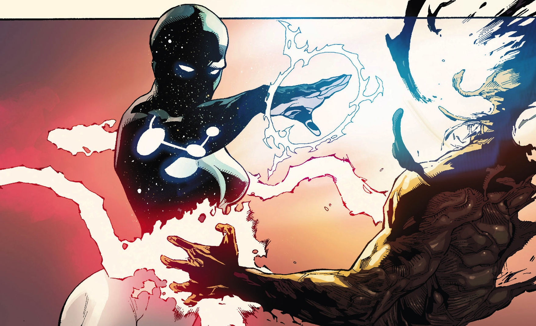 It is here, on the beaches of Australia where another Earth is on track for collision. This is the first issue that effectively joins the plots together and gives a glimpse of the final battle.  As Black Bolt lays afflicted in the remains of Attila, Thanos rejoices in his new found treasures whilst the Illuminati are greeted by a surprise guest: an Aleph. This alternate universe minion, requests the presence of the group on behalf of the Builders. As they are transported to a ship, a universe away, this is the welcoming party in tow.