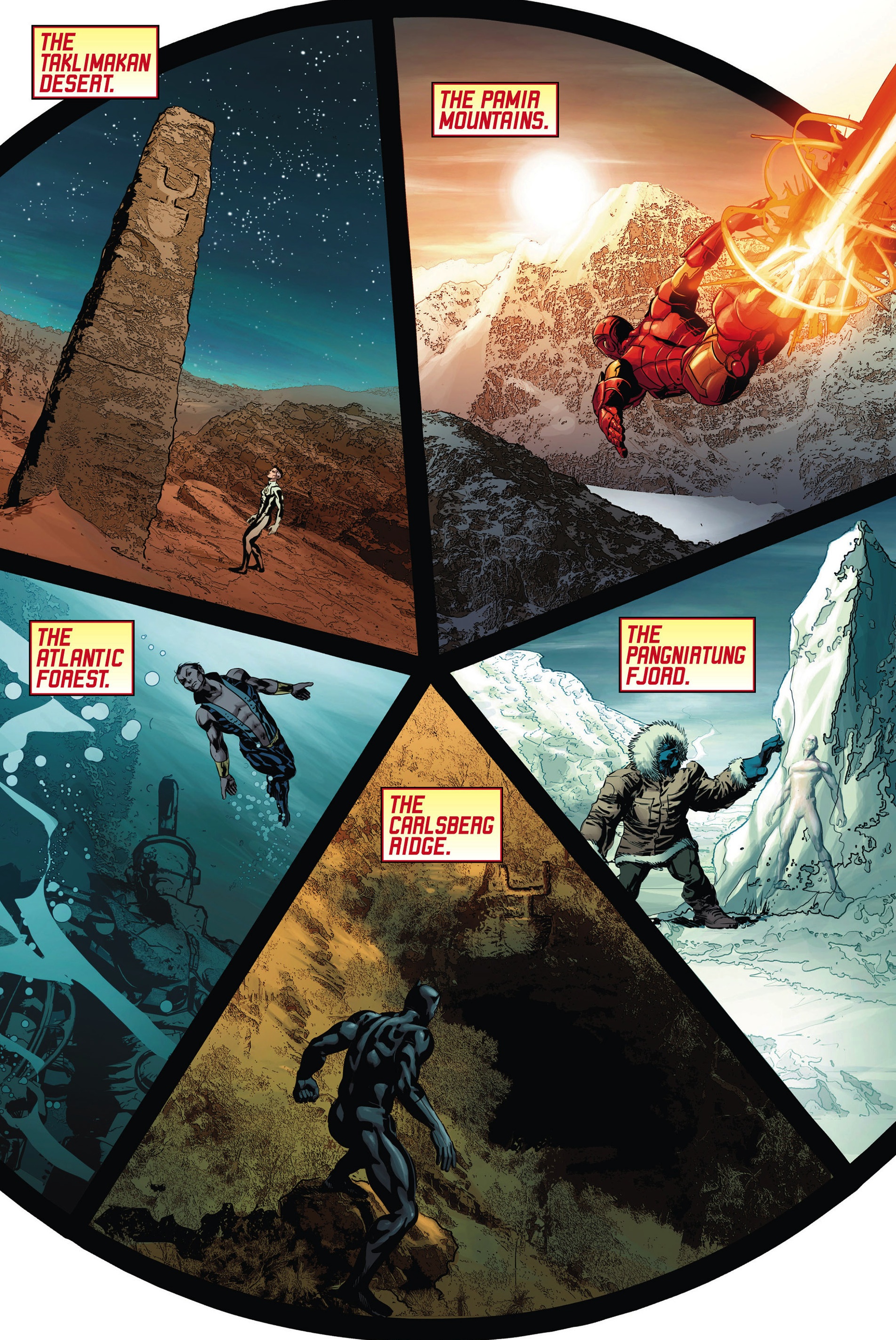 After their battles, the Illuminati are in search of Thanos’ successor and separately go about trying to find him. There is a gorgeous panel of six of the Illuminati travelling to various locations, depicted as a circular panel. The colouring and environmental contrast of the individual panels are gorgeous. Unfortunately the member of the team that succeeds is Dr Strange, as he gives away the location of the Greenland village to Ebony Maw. His possessor subsequently leaves him, without prior memory, and returns back to Thanos. Over the last couple of issues, the Illuminati have received signals indicating another incursion. The red implants imbedded in their hands glow, indicating the presence of an alternate Earth in close proximity. If you recall the earlier issues of New Avengers, you will note the previous incursion and the preparations made for further invasions. That time is unfortunately now and is the first step in combining the stories of Thanos and the Builders.