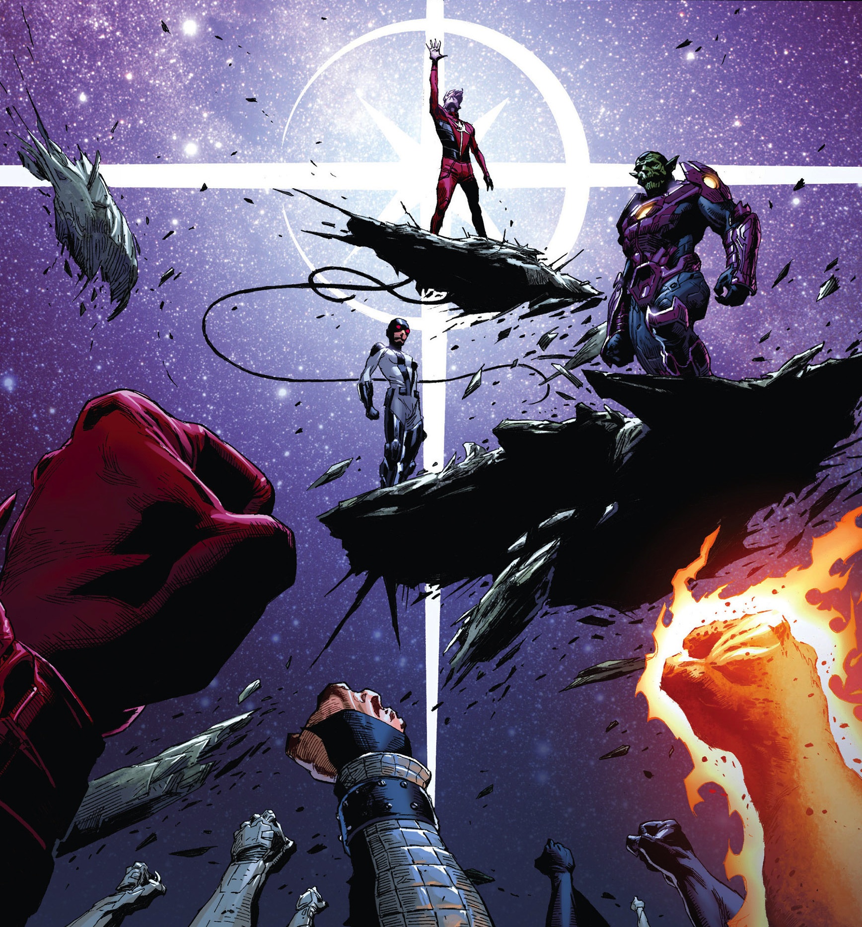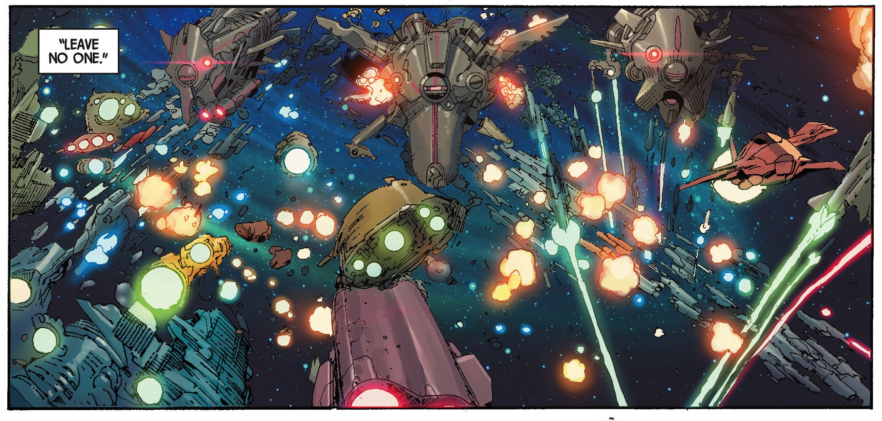During the middle of J’son’s folly, the Council hatched a plan and it involved surrender. The Builders felt they had made their intentions clear and offered terms of apeasement for the Council. One by one different worlds gave in: The Centaurians, the Kymellians, and of highest significance, the Supreme intelligence of the Kree empire. As Ronan returns to his homeworld to lay down his weapon, Cap instigates his ruse. A Council fleet is sent to attack the Builder’s Command vessel, who are caught unaware as they bask in their supreme mentorship. Hickman produces an amazing line during the midst of this battle, emphasising how egotistical the Builders actually are.
