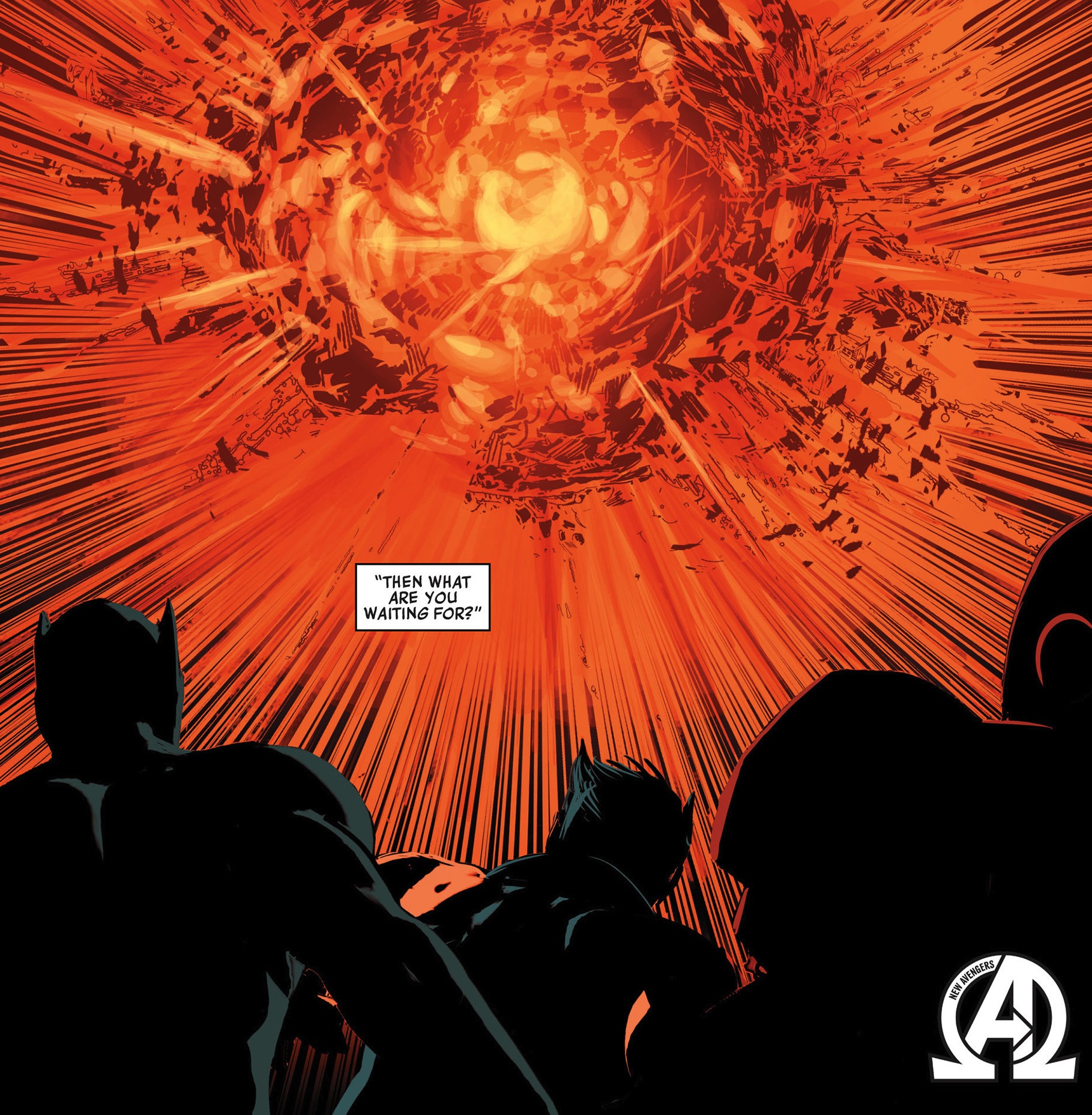 There has not been an image like this in the New Avengers book, and the Builders and Ex Nihilii have never made an appearance. The red colour and insignia aberration of the Ex Nihilii, indicate they are not of our universe. The Builders look similar but come with an informal testimony that they are here to destroy a world and invite the Illuminati to observe it. It is finally at this point that Stephen Strange’s possession is revealed by an Ex Nihilo, as he relieves him of the shadow of Ebony Maw. Once again this is a beautifully rendered panel. The final revelation is delivered and it involves the multiverse. Way back in issue #7 of Avengers, we were introduced to the Superflow of the universe, which acted as a communication satellite between universes. The Builder describes its collapse and fracture, rendering them incapable of traversing the multiverse. This information was brought about from the capture of the Builder that escaped Captain Universe, fleeing towards the point of incursion. He re-iterates that Earth is the centre of universal annihilation, meaning that it’s destruction is the only measure left for survival. As Reed comments that destroying a single Earth will achieve nothing, he is met with an ominous answer: that all Earths must be destroyed across the multiverse. The Illuminati are ejected from the World Killer craft as they watch the Earth of another universe explode. The final words issue an ominous warning: