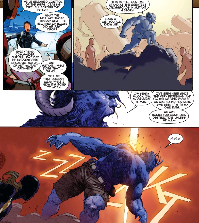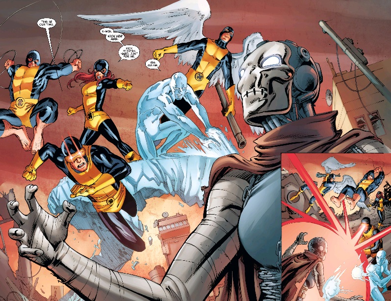 As a final incongruity Jean shouts at Wolverine and Cyclops for dividing the X-Men. This happens in the future anyway, otherwise why is there a Brotherhood and an X-Men team post presidential election? There is a moment of hilarity with the unceremonious departure of future Beast. As they try to develop a ruse by having S.H.E.I.L.D. fire on all mutants, he shouts a rallying cry to unite the X-Men but is then immediately killed. The current X-Men cast no doubt on S.H.E.I.L.D. and immediately carry on defeating the Brotherhood. As a plan B for the Brotherhood, it fails in reality but failed much earlier at its inception. Given all that has come before, given that there two X-Men teams that do not wish to start a war with humans, do you really imagine that a S.H.E.I.L.D. sentinel will bring everyone together? It is a poorly executed plot after thought. This story has been done exceptionally well in the past, with two leaders that epitomise the mutant race dichotomy: Magneto and Xavier. Besides this has absolutely nothing to do with Xorn’s problem, and I imagine once they converted everyone to the ways of the Brotherhood, young Jean was then going to be sent back home? It is an ideologically unsound premise that resulted in a massively confusing story arc.