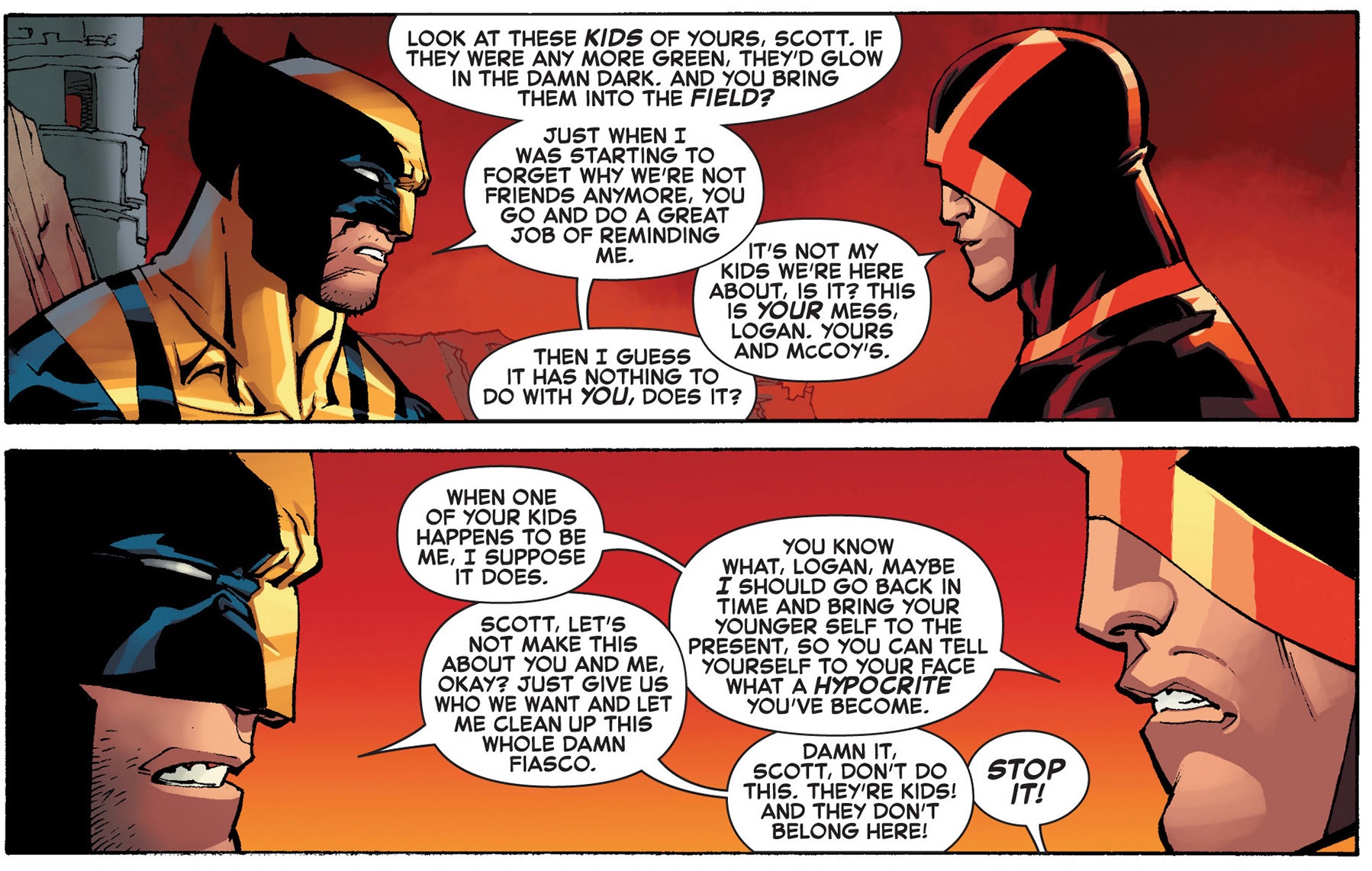 As with all of the conflicts, they seem too start suddenly at the point at which some character is revealing an essential plot point. It is the foundation stone of the single comic, where in order to build suspense, heroes ready their weapons as grandstanding gesture. As a readership, you may say we have matured because now the suspense lies in our desire for plot development, especially considering fights in this book lead to insignificant consequence. Anyhow I digress. As soon as Scott declares his willingness to help his younger self and Jean, the Wolverine and future factions of X attack. This was one of the better confrontations, as it is fan serviceably enjoyable to see Emma attack Jean. The battle of the minds between Jeanie and cynical Xorn was well illustrated and led to a formidable conclusion. Jeanie catches a glimpse of her future and decides it is not for her. Therefore the battle ends with some cuts and bruises with everyone in agreement: Those pesky kids gotta go. So we are all on the same page right?
