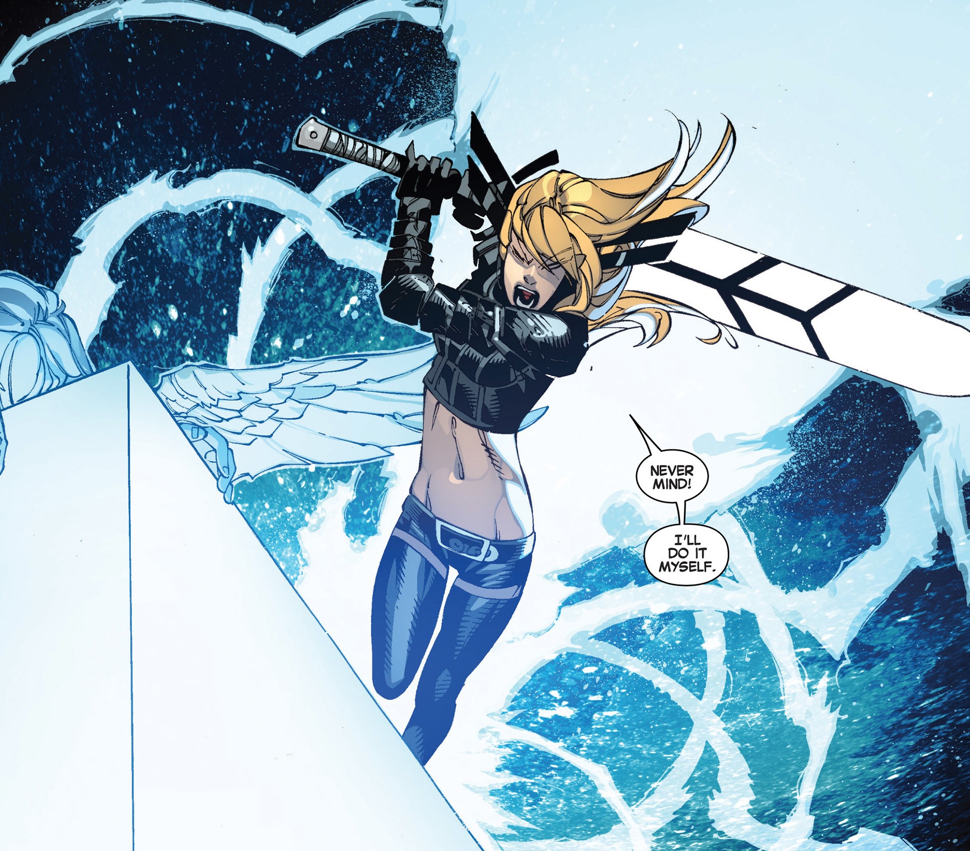Kitty plays the role of the independent advocate of the young X-Men, and is a role that is performed successfully at some points. She provides the counter argument to the overwhelming evidence pointing to sending the kids home. It is a simple truth, they should be allowed to do what they wish. It is a difficult position to justify because we did see both Scott’s die, but it is not the first time a character from another time sets up shop in the present (Bishop, Cable, Rachel Grey etc). This does not take away from the importance of her position because without her, everyone would be in agreement in theory and there would be no story at all. Her thought processes move from being adamant about them returning, to having the younger guys make their own decision. As a teacher this is her duty to her students, which is something that Wolverine and Storm have forgotten. This is what prompts her departure from the school at the end, and it is a valid enough reason. Ultimately this becomes a complete moot point because the X-Men cannot actually return, for reasons unknown to probably Bendis himself. In any case it is a reasonable piece of character exposition, which is lost somewhat amongst all the fighting. The easiest way to succeed with this subplot was to have a focus on Jeanie and Kitty’s rapport throughout All New X-Men. Not only would this have brought validity to her argument as a teacher, but also a sentimental element to her close friend. There was an extremely irritating moment earlier in the crossover, where Kitty states, quite damningly in front of Magik, that she could not be trusted. However at the end of the book she hugs her, as she is welcomed into the Uncanny X-Men. This inconsistency lies between two of the more important characters of the arc and is frustrating. Now we come to Illyana Rasputin: