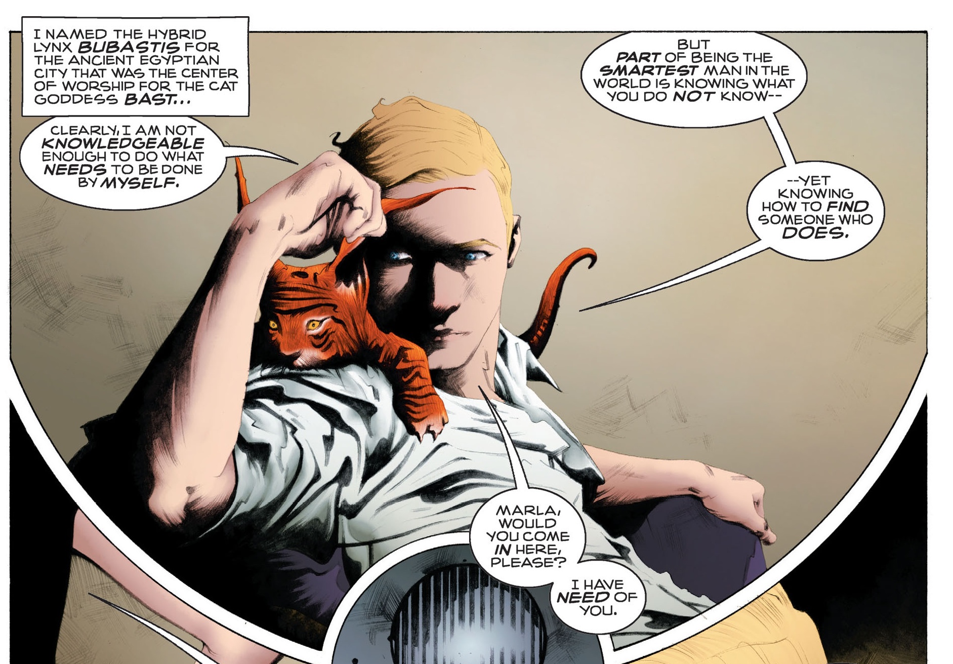 This final panel once again utilises the silhouette of a tree, but this time it is burning, providing the most impressive burnt orange atmosphere. Combine that with a young Clark staring at his long dead father, and you feel a longing sadness with our boy scout. What I love most about it is that Clark’s face is barely visible through the shadows cast from the camouflaged sun, but his posture is defiant in belief as he sees the ghost ahead of him. The alternate universe Pa Kent is standing frail and afraid as he clasps his hands in front of him. We are unable to see his face but instantly we can tell he is anxious as he faces a younger, brasher son ahead. The angulation of the page is an interesting effect that provides additional vigour to the tree, the fire and the characters introduction. Pak’s writing is engaging to the reader and sets the scene perfectly as we witness the emancipation of Superman. Whether you find Jae Lee’s work stunning or stifled, when you come across a panel like this, then there is little doubt that he is a delectable treasure of the comic world.