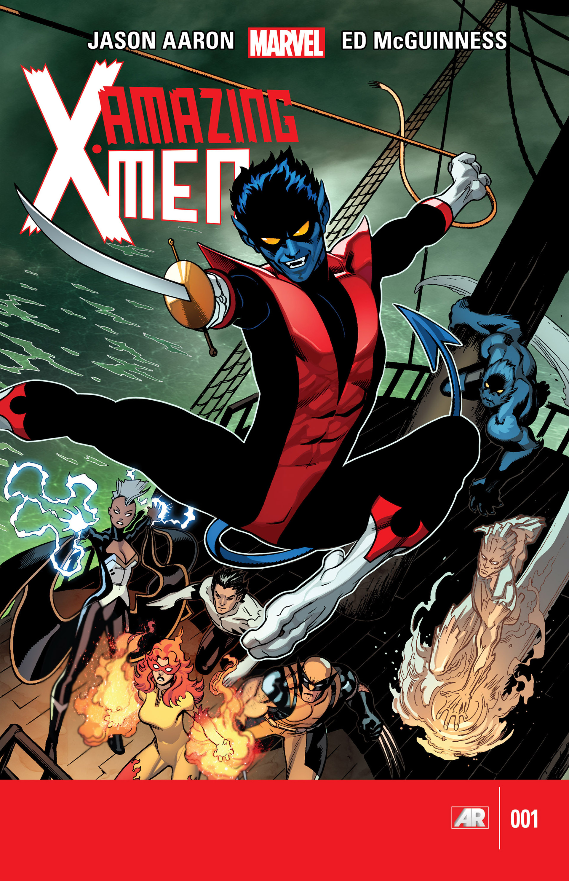 I have been quite impressed with Ed McGuinness these days, because for a long period of time I have not been. His work on Hulk was too caricaturist and almost seemed to be geared towards children. But since the run on Nova I have warmed to him quite nicely because he has lost his adolescent over-exaggeration. His moderated pencils integrate seemlessly with Aaron’s X-school thematic, as he brings out the teenage pomposity. But forget all that because this cover is about one man, the return of Kurt Wagner aka Nightcrawler! Not only does it feature a long lost X-Man but Ed captures his swashbuckling persona as he swings across a mast with cutlass in hand. His pose is almost kung-fu in nature as he fully flexes and extends, displaying his physical prowess, whilst in the air. His visage is demonic as ever but also beaming with a smile, as McGuiness captures his optimistic and playful nature. It has been such a long time since we have seen Kurt and this cover shows the full extent of his exuberance and cheerfulness. The actual double page splash of this cover directs Nightcrawler to his enemy, his own father, Azazel. The X-Men on the ship in the background include new additions to the crew, namely Firestar and Northstar, filling the void left by Kitty. The excitement builds as we can now see the development of the schoolteachers and how they may bond. As irritating it is having a further X-title, I am very excited about this first arc and cannot wait to see more of our revered and resurrected friend.