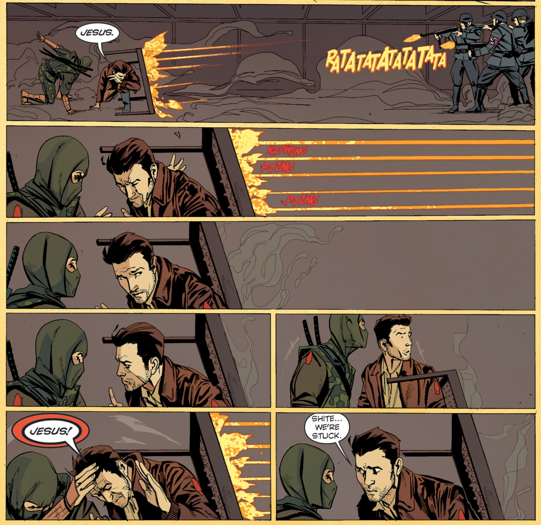 Of course this book is not all about dinosaurs, it is about Nazi’s too. It unfolds that the Germans are cultivating these creatures with an endgame of producing chemical weapons. Thus a unlikely band of heroes enter a bar, fight with Flynn with a view to recruiting him back into the war. We have the tough brawny Brit, the Japanese Ninja and the sassy American dame joining the plucky Irishman. The story progresses with multiple twists and turns and become quite the action packed caper. We see multiple action sequences that involves fists, knives, guns, tanks, trains, planes and boats. There is even a shark in there for good measure. The writing is very succinct and precise because the multiple cinema tropes are at play require minimal explanation, so we can freely enjoy the art at hand. It is strong storytelling with perfect artistic balance.