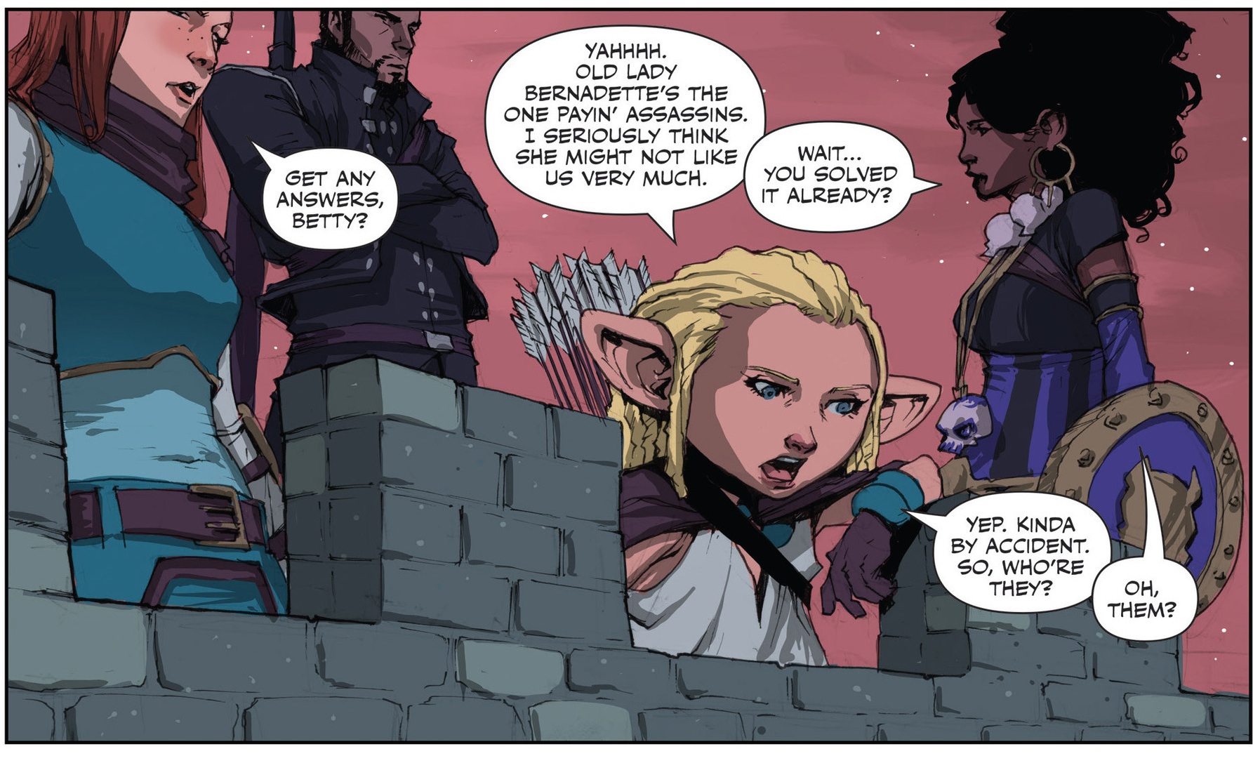 Weibe has effectively set up an humorous but dark toned narrative within a magical little village and it’s eccentric and quirky inhabitants. The pitch is very much akin to Saga, as it plays to an adult audience with an unmitigated and compassionate vernacular. There is a limited amount grace with our Queens, but in the world of dungeons and dragons this is not necessarily a feasible quality. This title is a fun and enjoyable to read and it does not hold back which is probably a significant part of its appeal. At the moment it is quite light hearted what with all the murder, lying, drinking, and broken relationships but I can tell it is about to get serious. There is much more fun to be had as we learn more and more about our four beautiful mercenaries.