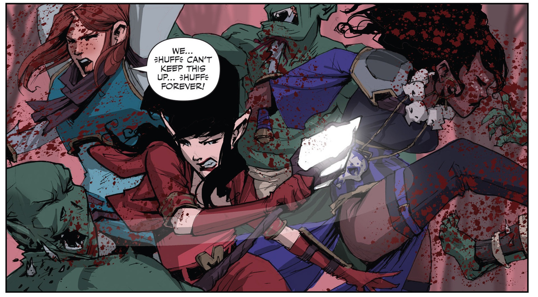 Not only are our protagonists recognisable by their physical characteristics but also their facial expressions, which is plays into their personalities. Hannah is the mysterious mage who always appears intent and curious, Violet is an aggressive Dwarf always ready to fight, Violet is calm and collect, taking things in her stride and Betty is the playful little hobbit surprisingly fierce in battle. Their characters may be set out by their race but Kurtis Weibe is careful to not conform to stereotypes, as he is slowly unveiling character backgrounds as each issue progresses. There is a lot to discover, but it is enjoyable enough to witness the raucous, crass and lewd behaviour of the Queens as they fight orcs whilst trying to uncover who is trying to assassinate them.