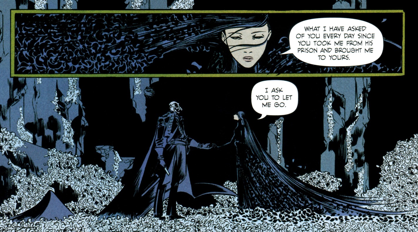 Kelly Sue may have created the feel of the book but Emma Rios has stamped her style on its appearance. Her work is ethereal with elegance and grace tackling harsh environments and even harsher relationships. There are a few distinct scenes in this issue and Jordie Bellaire is a phenomenal in making them all caress different aspects of our soul. The glowing spring scenery of a hummingbird beating its wings rapidly in the rain, compares to the black shades of hell where Death wallows in sorrow. Her characters are distinctive not only in their facial features but also their posture and stances. She is not afraid to devote attention to the hideous natures, as she does not shy from Ginny’s scars or Death’s goat skull head. In fact the more time you spend with them, the more beauty seeps through from them. Emma’s inking is exceptionally precise but not overtly detailed that is crowds the image, as the details of Mason’s reflection are not immersed in water ripples. There is a beautiful fight between Ginny and Mason, which occurs splashing in water and is expressed through small closely focused panel boxes sitting atop loose landscape overviews. It moves quite fluidly and feels more like a movie reel focusing on different focuses of a fight. Each page is emotive from the scenic tones of the story but also from the relationships presented. You can immerse yourself in it and let loose your shackles.