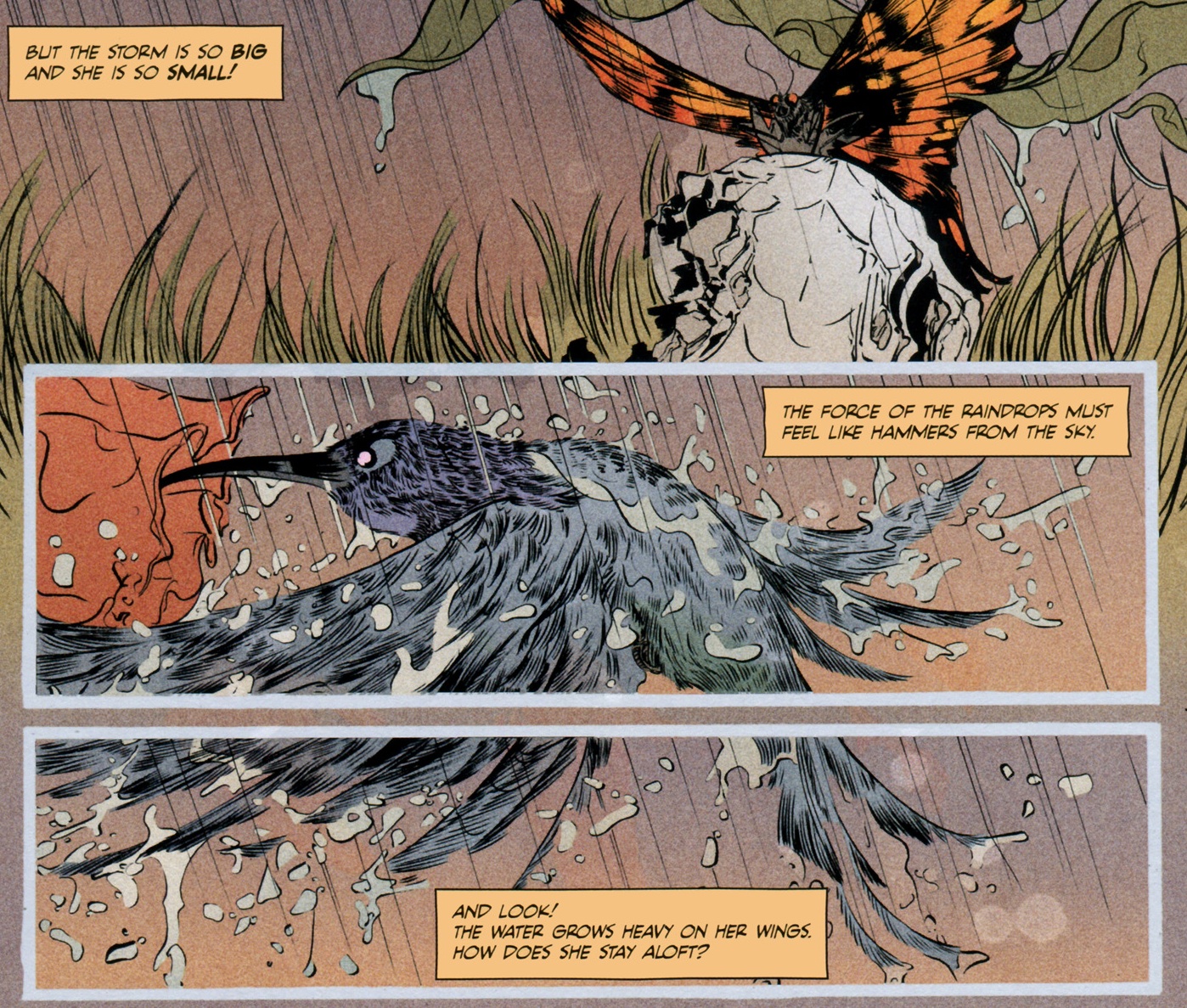 There are a number of tropes and descriptors that are befitting of this title but none of them adequately describe it. They include the Wild West, Purgatory, Redemption, Fantasy, Terror, Mythology, Witchcraft, and finally Salvation. From what begins seemingly innocently as a western, rapidly turns into something altogether different with a cast of characters that seemingly have no obvious connections. These include a rabbit skeleton, a butterfly, Death, his daughter Ginny, a couple of men called Mason and Coyote, a young girl borne from the rivers of blood and a lot of crows. A multitude of emotions run through these relationships, all poignant yet unestablished. There is a host of anger and regret throughout and a deep sense of loss as exemplified by Death’s daughter Ginny, full of malice towards a despondent and dispirited Mason. In fact the friendship between the bones of a bunny and a butterfly is one of the most refreshing and sweet companionships of the book. As you partake in glimpses of these character’s adventures, you become lost in their worlds and a wanderer in the fantastical realms of Emma Rios.