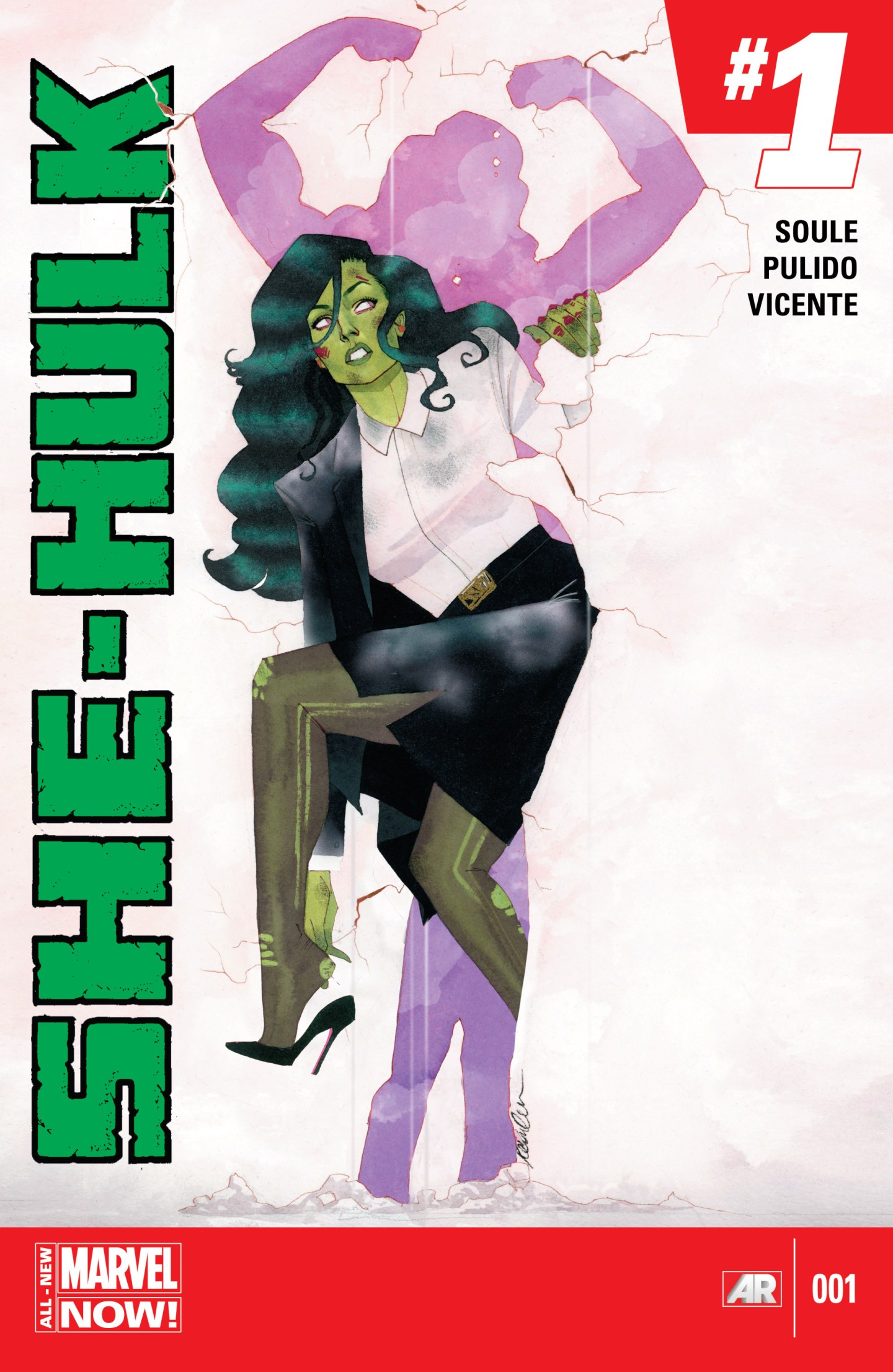 If Superman was this sloppy when it came to changing back into Clark Kent, then his secret would have never remained. Though Ive no actual idea how a roaring hulk would break through a wall in such a manner, but it is fun to imagine. I have always liked She-Hulk especially when she was written by Peter David, and I am excited to see a solo book return. Wada’s art is very soft and pleasing to the eye with some gorgeous colouring, complementing her green and purple colouring perfectly. Not only does she appear like she is emerging from a hole in the wall, but also a hole in the front page of the comic. The cracks appearing from her silhouette are a lovely touch. I also adore the look on Ms. Walters face as she looks up at the damage she has just done whilst trying to change into her work clothes and put her shoes on. It is the classic theme of a superhero trying to maintain two lives, even though Shulkie clearly is not trying to hide her identity. The bruising, blood, dust laden skirt and frayed tights highlight how difficult it is to achieve a work/superhero life balance. But she endures, as they all do and is determined to get back to business no matter her condition. This is only testament to her the resiliency of her character. The added touch of having lettering down the side of the page, adds to the giant sized nature of She-Hulk. This is such as gorgeous cover and may well set the theme of her brand spanking new solo book.