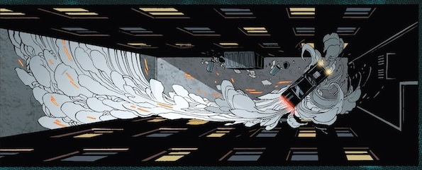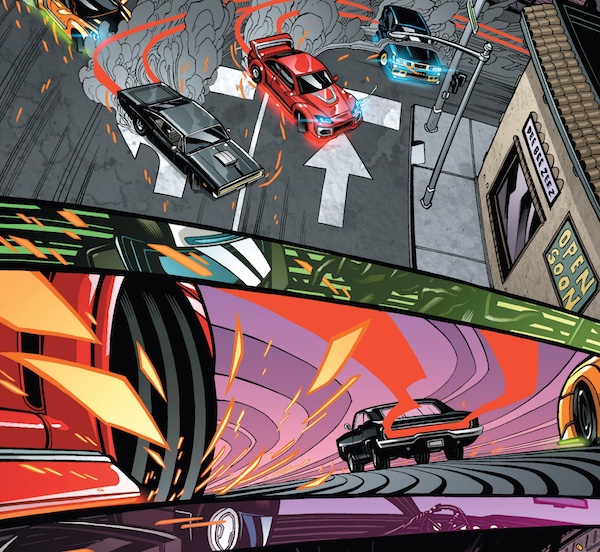 These touches are less utilised with the car chase scenes, but Tradd and his colourists Daniel and Staples bring out the fervour with a different tact. The solid machines are less amenable to elaboration but the effects of their speed are not. The lighting effects sell the scenes as the headlights are drawn as lines brings attention to the speed they are doing. It is not only that but there are literally sparks flying from the wheels of the cars. This may not be realistic but it looks great, especially when you are able to bring additional colours to the panel. The contest is at night which means you are able to utilise different lights to brighten the scene and accentuate the speed. The use of momentum lines also adds to the effect as we seen the road and sky brimming with velocity. The reflections on the windows and helmet are also a nice touch.