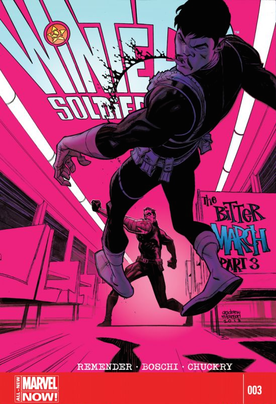 The recent covers of The Bitter March arc have been quite stylish and dynamic. Robinson has been portraying motion in quite interesting ways and this cover is no different because we have two directions to encompass on the page. Not only is the train moving forwards as depicted by the movement lines in the windows but the S.H.E.I.L.D. agent has been thrown backwards with the momentum of the punch. This is the more important feature of the book because it is taken from an interesting point of view. We are ground level looking up at our protagonist swing a huge hook, meaning the recipient flies almost above us. I find it quite amusing how his shadow is reduced to a pair of feet hanging awkwardly. The angle it is shot at is an interesting choice and the perspective works quite simply. The train has its chairs perfectly sized to portray depth and the title of the comic also helps with this effect. It is written on the roof of the train and enlarges as it comes towards the viewer. Just adjacent to this is the fantastically battered face of this agent, with blood arcing as it leaves his mouth. It is another subtle effect giving the impression of movement and violent intent. The overall page is interestingly coloured and I struggle to differentiate between it being a dimly lit carriage with red emergency lights, or just a cool effect. Nonetheless it is quite aesthetic and the shading on the flying victim’s face is adapted suitably. Ultimately the impact of the force used by Bucky is the essential ethos of the cover and the direction in which Robinson has used does little to impress his physical appearance but more the prowess of this strike. The Winter Soldier is certainly not to be trifled with.