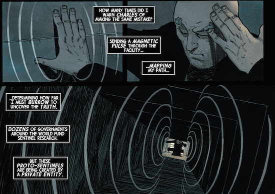 Cullen Bunn has developed a reputation as a diverse writer who can turn his pen to a variety of styles and characters. He has recently started working on solo villain books, which includes Sinestro for DC comics. Magneto is a book that comes straight to the point, with no airs and graces and this is reflected with the internal monologue narrative. The initial comics depict Erik discovering a collective developing a new form of human-sentinel hybrid. This particular issue directs him to a facility that is creating them and something altogether more sinister. He confronts the project leader who reveals the intentions of the facility and their underlying motivations. Dr Alain is far from the mutant hating scientist of many an old genocidal faction, but is uniquely driven by self-preservation. Her wishes are live in exile from mutants, finding peace in isolation. The sentinels act as defence mechanisms instead of mutant hunters. It is here that Bunn explores a deviously unsettling juxtaposition: Magneto once created the exact same thing and in Genosha, had created a mutant city under his protection. Unfortunately that met with disastrous consequences as it was brutally destroyed by sentinels. Ironically Dr Alain is using the prototype machinery that was used in that very attack to create her own defence militia: The Master Mold.