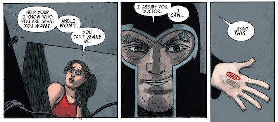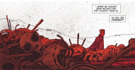 The comic is fantastic in addressing Magneto’s own miserable past and his inability to find solace in repentance. There is a solemn undertone to his narrative, and his original sin is the rationale for his immoral and abhorrent behaviour. There are some incredible flashback sequences that depict the demise of Genosha and Magneto exploring the remnants of what he once built. Gabriel Hernandez Walta’s art is as unforgiving as the writing because it is dark, thick and heavy. It is not the most aesthetic of comics, but its sense of dread is perfectly in keeping with the tone of the book. Magneto appears dishevelled and devoid of sleep, with an unshaven stubbly appearance. He is almost unemotional throughout and barely changes expression, wearing the permanent degree of remorse on his person. His powers are well controlled as Walta uses inventive ways of manipulating magnetic waves, including using it as an EMP device and manipulating a paperclip into a devastating weapon. The characters are almost muted in their drabness, as we see blacks and grays throughout, in fact Magneto seems a pale faced old man. Jordie Bellaire has captured that misery perfectly without plunging the comic into darkness. If you take the underlying premise, the inconsolableness of its central character and the actions undertaken, then you can appreciate the dour nature of this book.