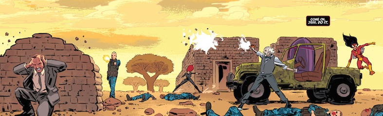 Kot is not ambitious enough to carry out a plot line that involves all the characters simultaneously, and similarly to the initial issues he divides the Avengers. This does make the book more palatable and provide a specific flavour to the tale, instead of poorly utilising some characters in one giant fight scene. This issue features Natasha, Phil and Jessica heading to the Middle East to prevent a genocidal maniac activating a post-nuclear-reality-altering bomb. Clearly a battle ensues in the desert and each hero has a specific role to play. Widow does the heavy lifting with Coulson providing ballistic support, and Spider-Woman has to use her charm to disarm a talking bomb. A clever ploy given that she naturally gives off pheromones that attract the opposite sex, and her strategy is surprisingly clever and amusing. Meanwhile Natasha is busy defeating the armed guards and a clearly insane old man shouting, “you only live once” repeatedly. Coulson seems to undergo a crisis of confidence and almost leaves his colleagues at the mercy of a villainous poet. You can instantly appreciate the humorous plot that pervades the book whilst still covering serious issues such as fear, anxiety and lack of confidence. These are not feelings that emanate often in the heat of battle and all credit to Kot for not making our heroes all-powerful.