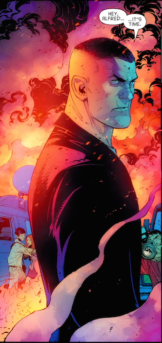The final set of images depict Batman out of costume, as Bruce Wayne. The Capullo Bruce Wayne is recognisable everywhere as his Batman. The eyes and the jowl are instantly recognisable and is quite the aesthetic appearance. It fits for a younger Bruce as he has an air of youth and naïveté, and works wonderfully for Zero Year where we rarely see him in costume. His resolve and intent are wonderfully portrayed in his expression, mainly because of the arching of his eyebrows and sleekness of his eyes. Once again there is so much credit to give for Plascencia who fans the fires and shades his face so impressively. The latter image demonstrates how Capullo can actually show Bruce being effectively beaten, and utilise the same strategies of perspective and shading to deliver the impact of the punch.