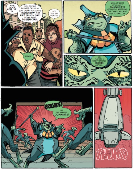 It is not surprise his character is a little on the rebellious side and he is a lover of classic action movies and punk rock. His best friend is Mo who’s parent adopted Jack when he was a baby. In fact his mother was best friends with his eventual guardian. I quite like the fact that his family is a black Muslim family and references are made to their lifestyle. It is carried out quite innocuously as part of everyday life and it is commendable that obvious emphasis is not pressed on such issues.The story then develops a relatively straightforward alien abduction story as Jack and Mo’s family are kidnapped. I must say that the intruders are comedically drawn on the caricaturist side as their forced pleasantries are barely able to hold their malevolence. Further upset is caused to our central protagonists as they realise that they are left alone and Jack may have lost another set of parents. Their responses are naturally written by Read and emotionally rendered by Oliveira. The next stages represent a rescue mission and a hunt for some form of space travel. This is where we meet the second half of the rather motley crew, Scrap and Han.